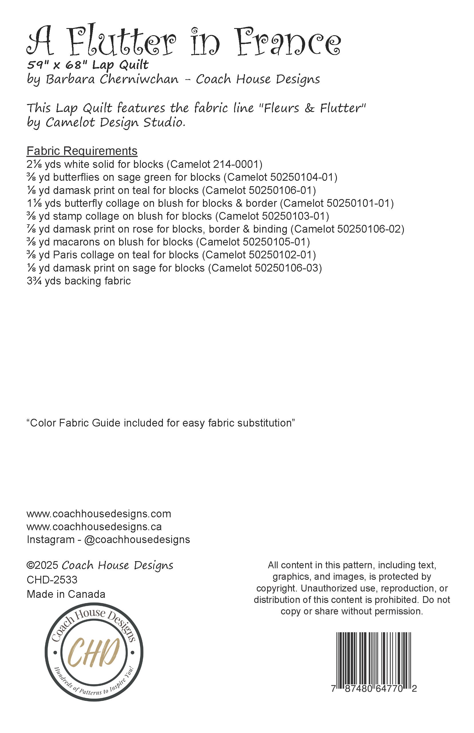 Let your imagination take flight with A Flutter in France, a whimsical 59" x 68" butterfly quilt that captures the elegance and romance of a Parisian getaway. Featuring the dreamy "Fleurs & Flutter" fabric collection by Camelot Design Studio, this quilt celebrates all things chic and charming — from fluttering butterflies and vintage passport stamps to dainty damask and decadent macarons.