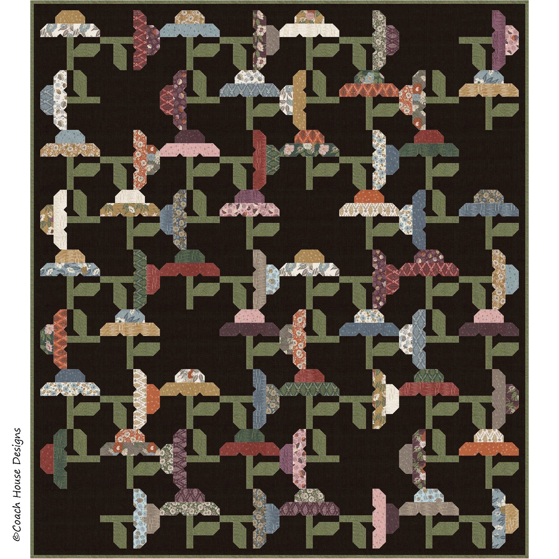 A field of flowers can look so different in the brightness of day or the darkness of night. This pattern uses a " Slow Stroll" layer cake by Fancy That Design House for Moda to build a meadow of coneflowers. The flowers are set in either a white or black background because I couldn't decide which one I liked better. The quilts measure 74" x 83". The pattern is available now and the fabric will be in stores in May 2022.