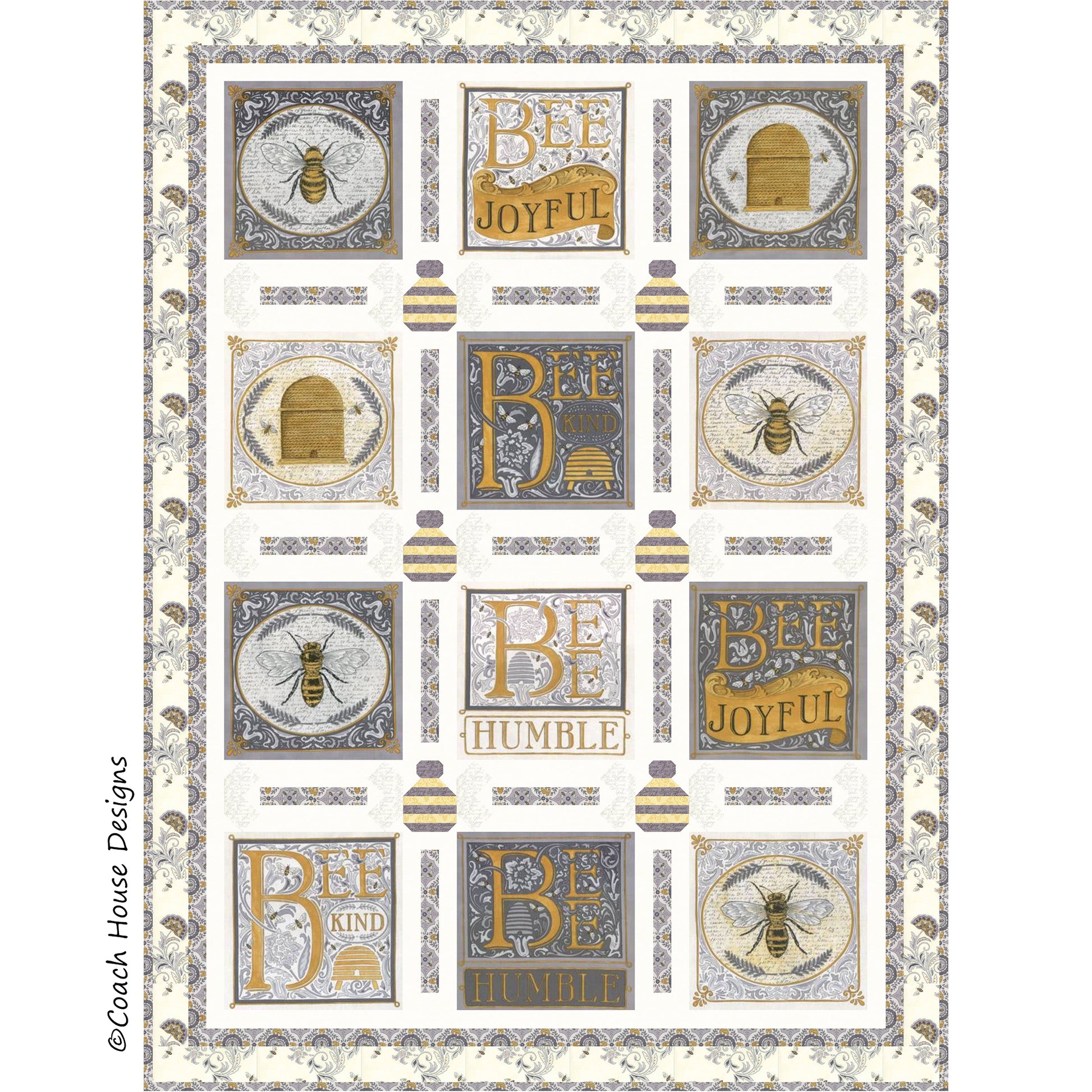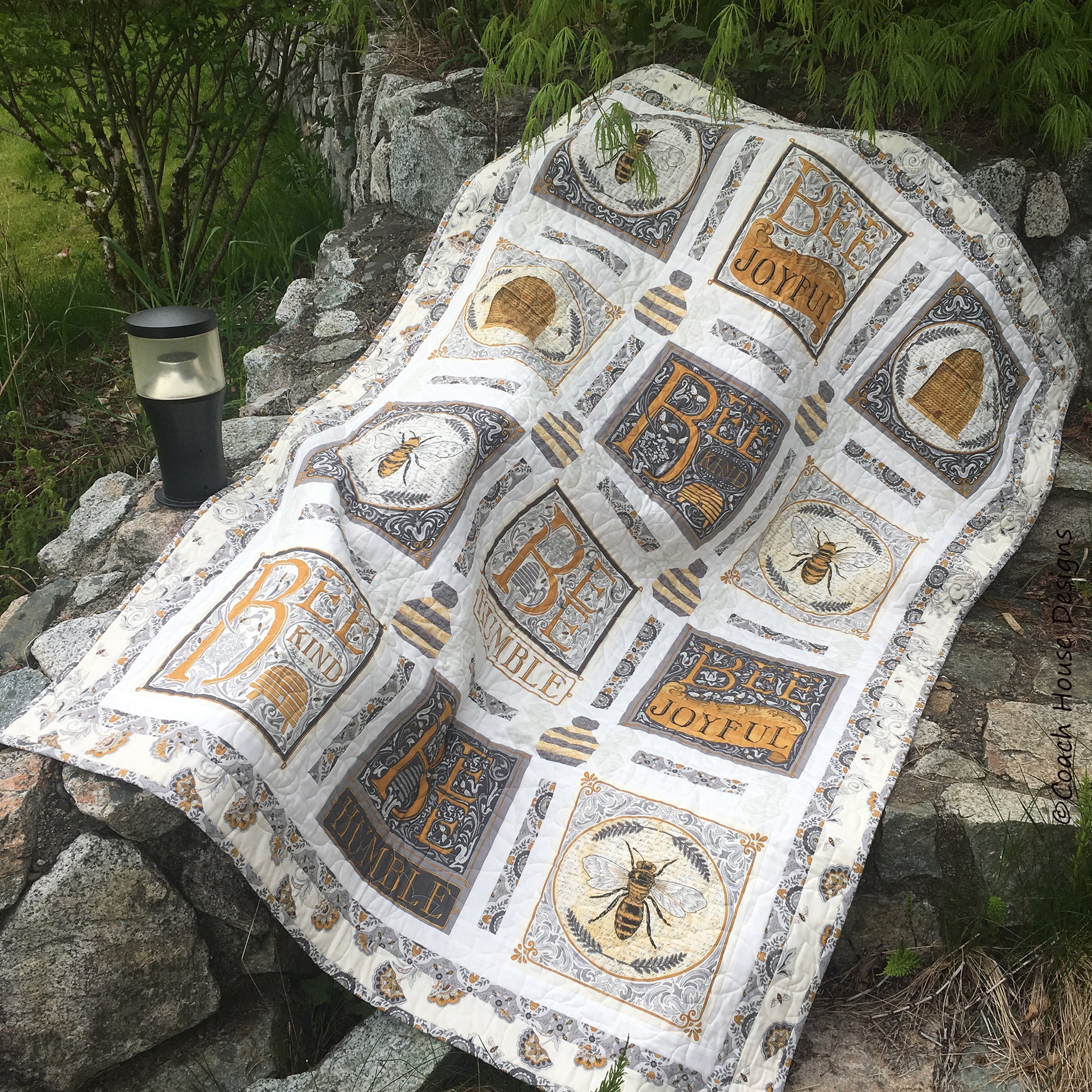This 44" x 60" sweet lap quilt features "Bee Joyful" by Deb Strain for Moda. The pattern uses two panels and simple piecing. The fabric was released in March 2019 so if you are looking to substitute the panel blocks, look for something with 10 1/2" unfinished squares.