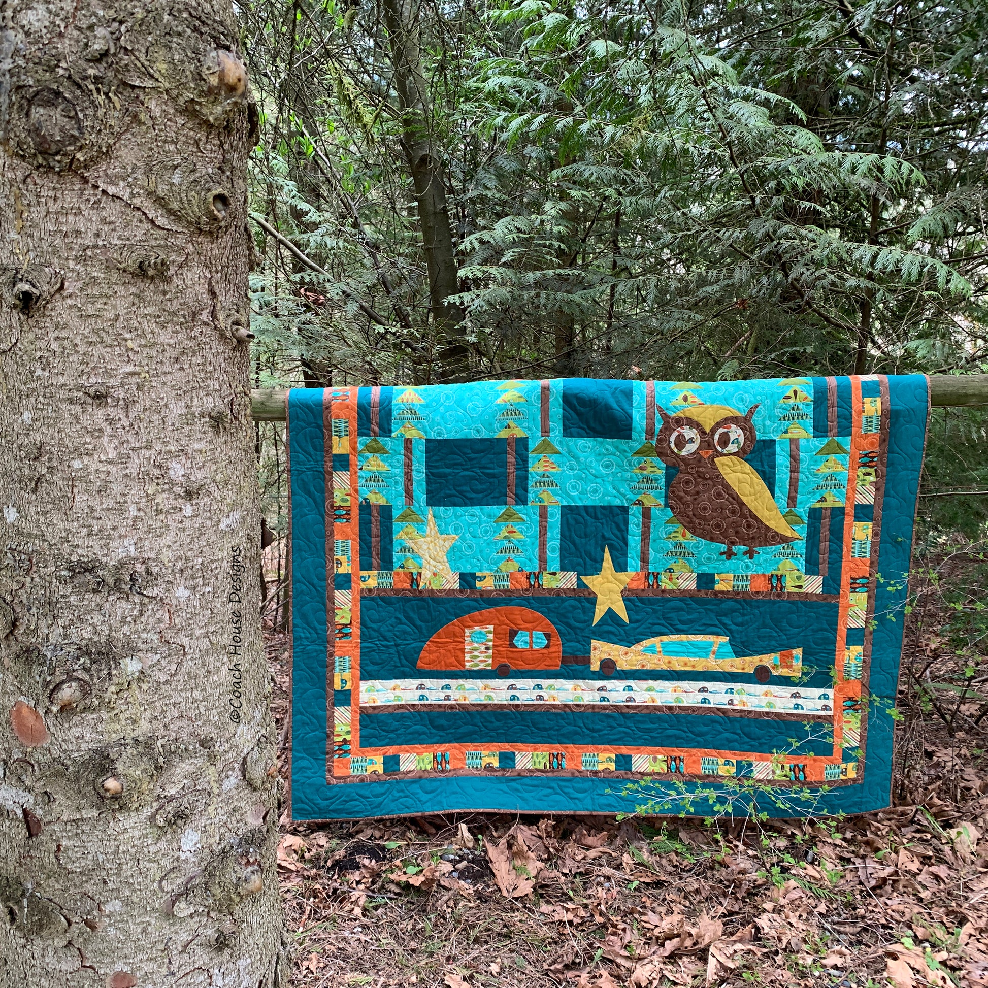 I love the retro feel of this large (almost twin) lap quilt featuring "S’more Love" by Eric & Julie Comstock for Moda. The quilt measures 72" x 82" and is perfect for snuggling up by the fire on your next camping trip. The fabric was released in 2013 so you will have to substitute but not to worry!