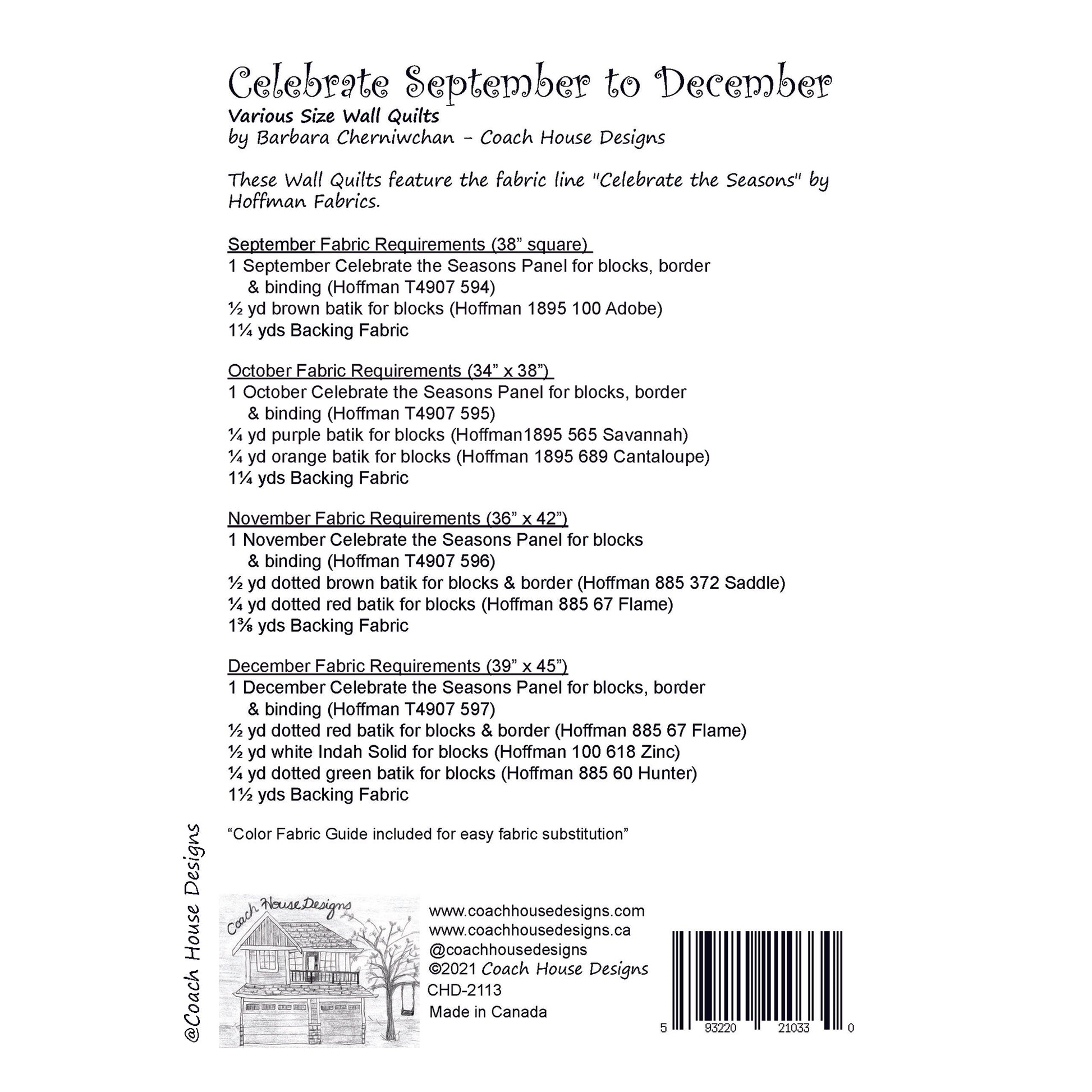 This pattern includes instructions to make 4 wall quilts: one for each month between September and December. The pattern uses the Celebrate the Seasons panels and attached coordinating prints by Hoffman Fabrics.