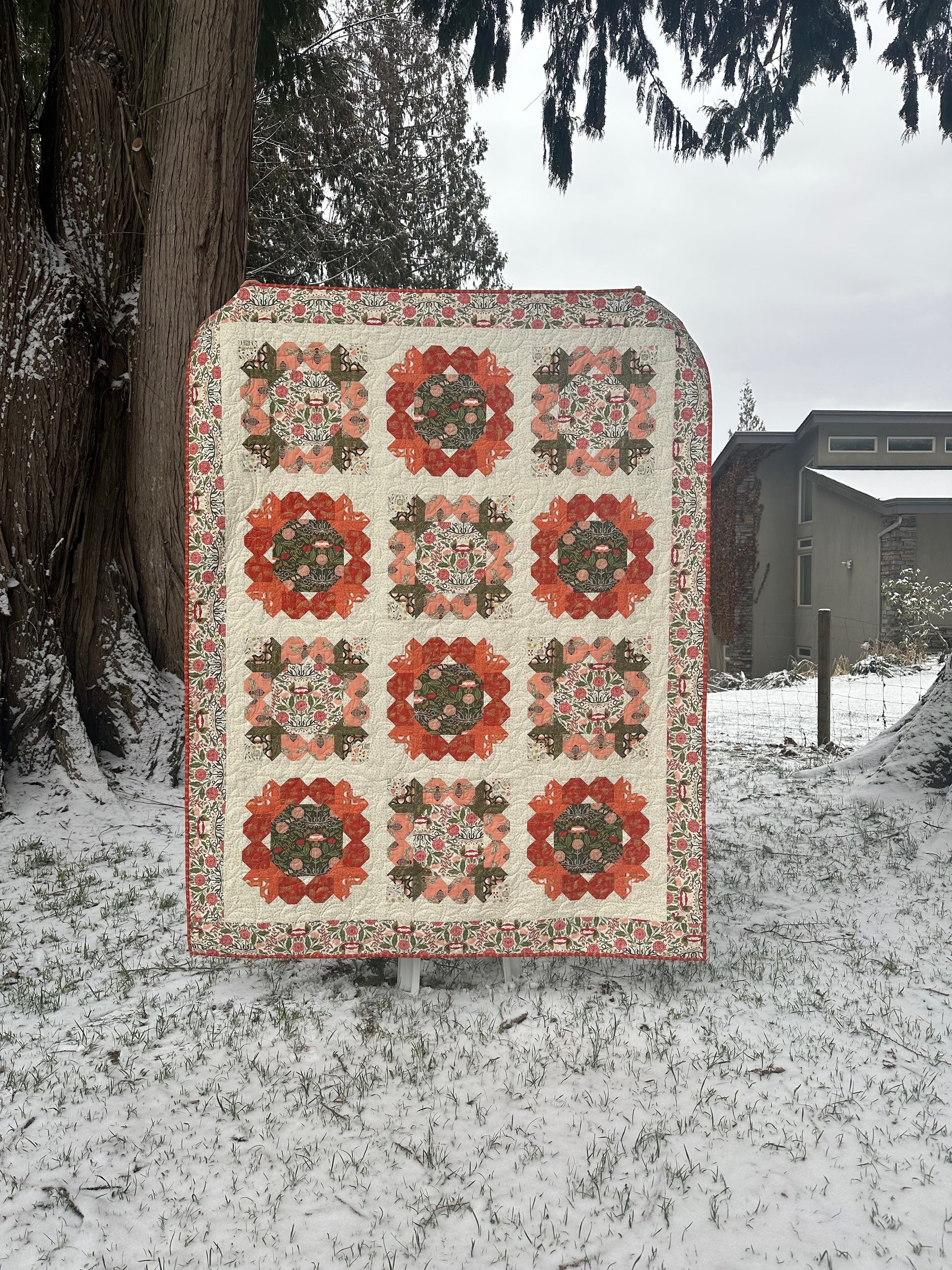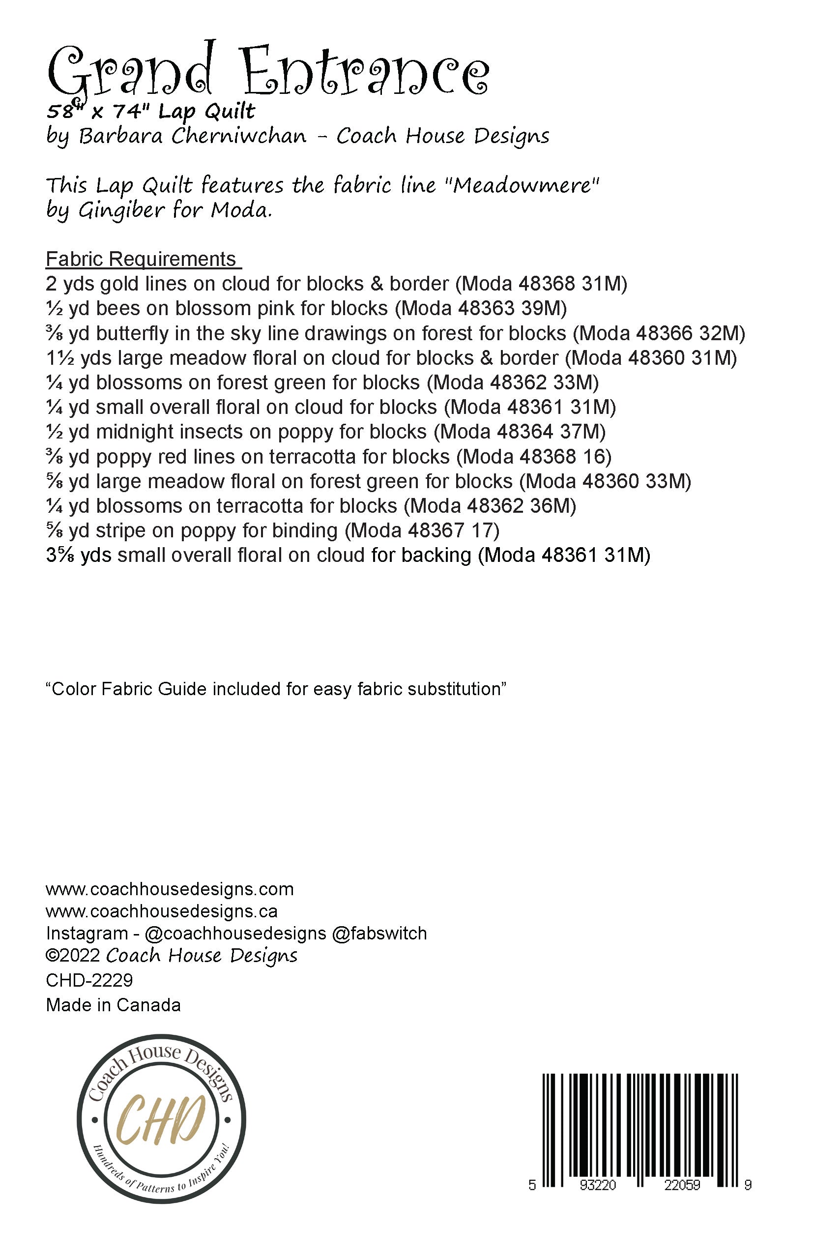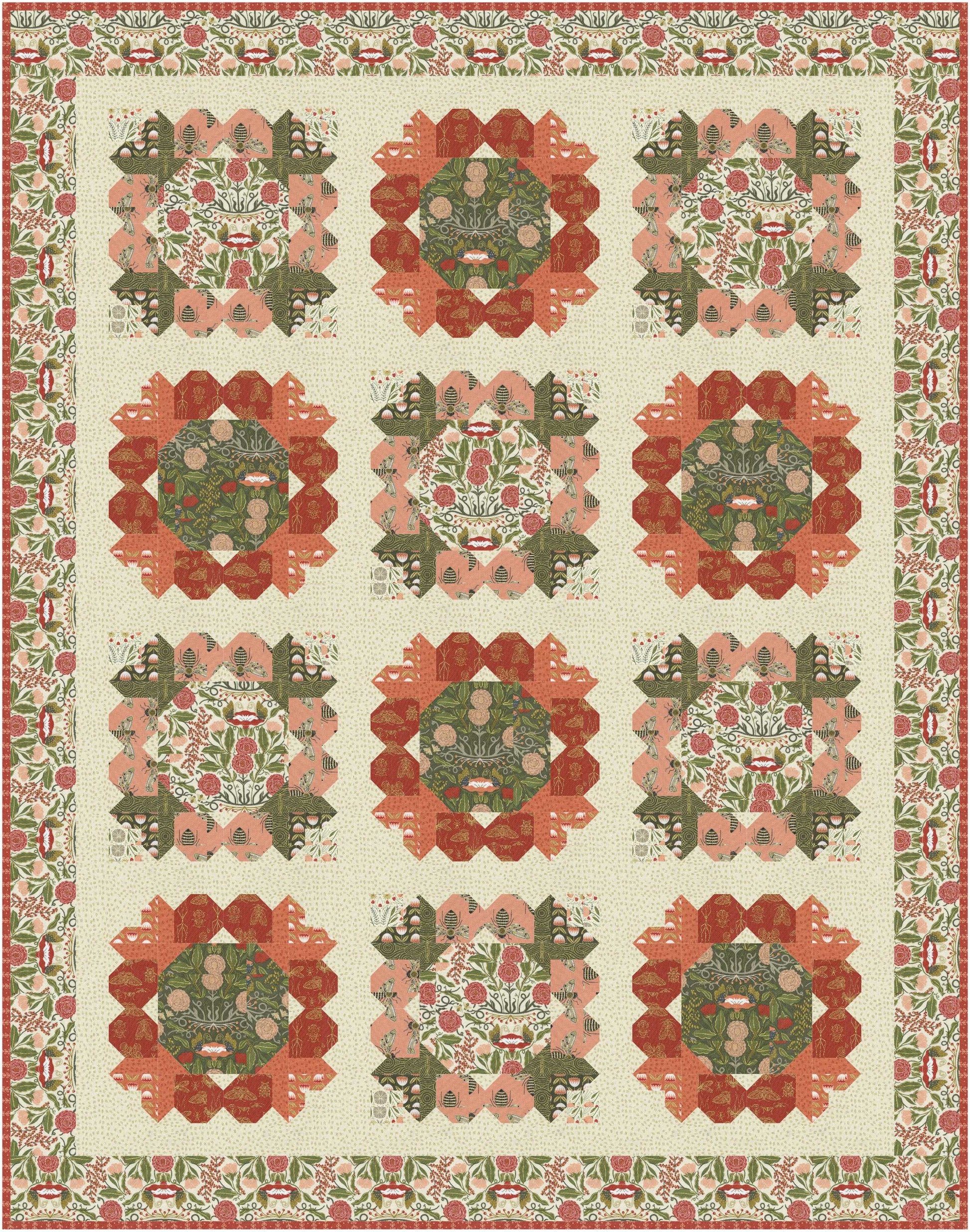 This 58" x 74" Lap Quilt showcases the beautiful fabric line "Meadowmere" by Gingiber for Moda. The elegant and modern floral medallions are all pieced.