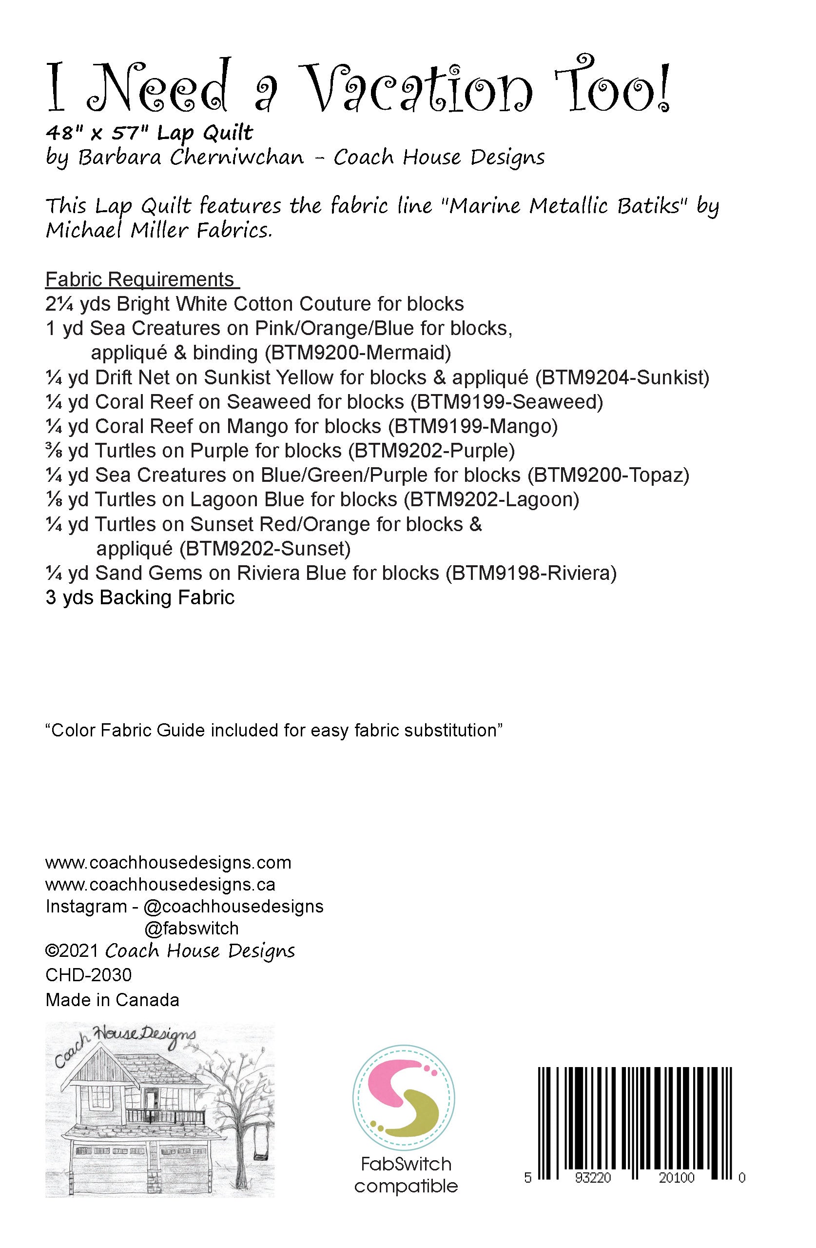 A re-colored version of I Need a Vacation!, this pattern features Marine Metallic Batiks by Michael Miller Fabrics. These fabrics are gorgeous and will be in stores in May 2021. Lap quilt measures 48" x 57". Quilt Photo shows original colors.