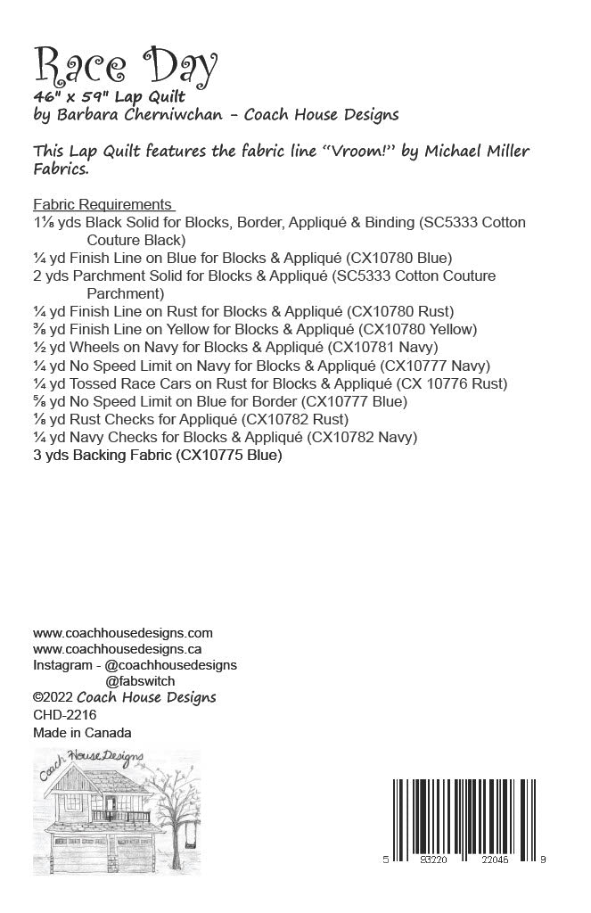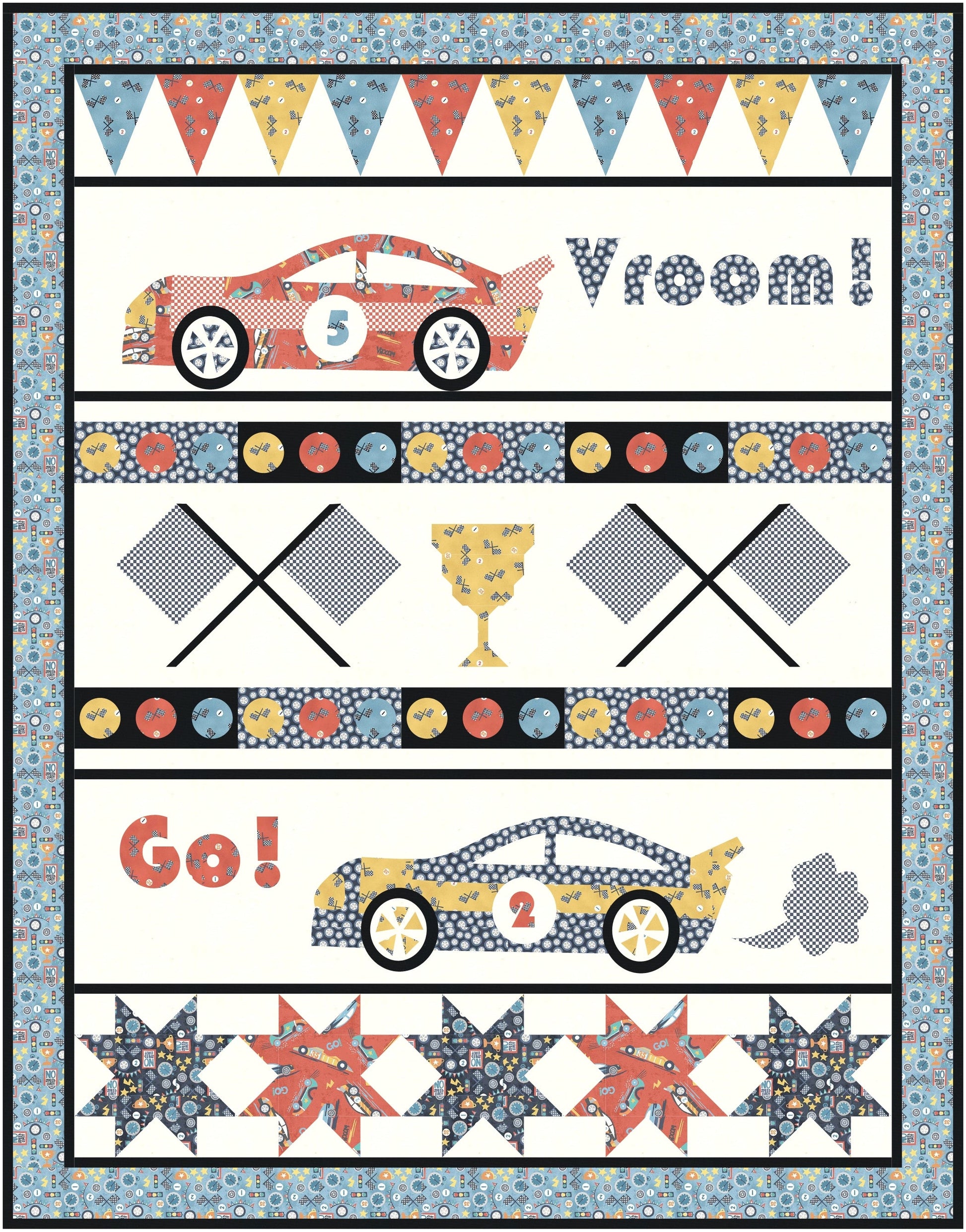 Vroom Vroom... This 46" x 59" children's lap quilt is perfect for your favorite little speedster. Race Day features the fabric line "Vroom" by Micahel Miller Fabrics, which is available now.