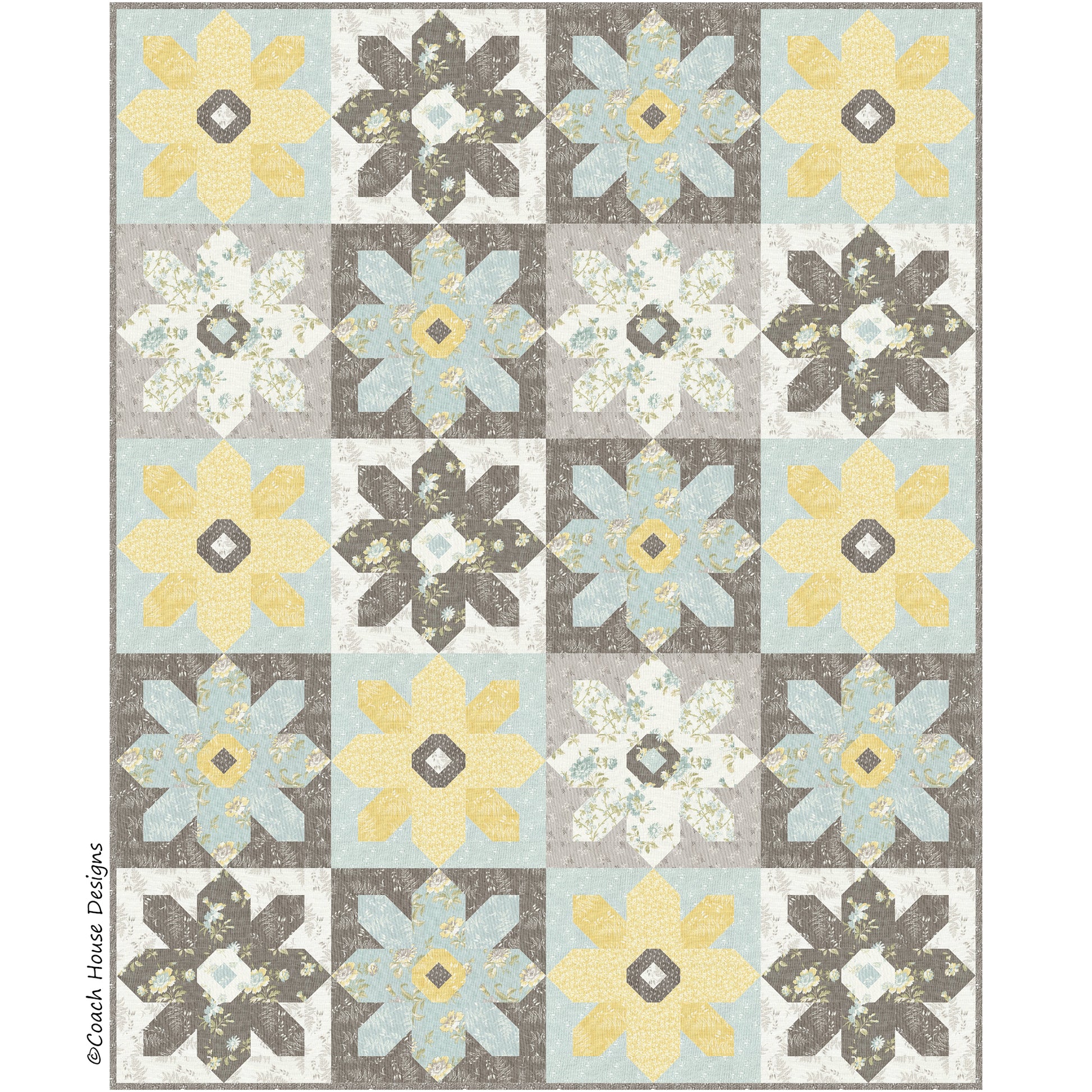 Bring to life a meadow of beautiful daises in bloom with my new Daisy Mae Quilt Pattern. Whimsical and gentle, this pieced lap quilt is full of floral charm and timeless elegance. The quilt finishes at 64" x 80" and features the fabric line "Honeybloom" by 3 Sisters for Moda Fabrics. However, it would look stunning in any floral, spring, or summer fabric.