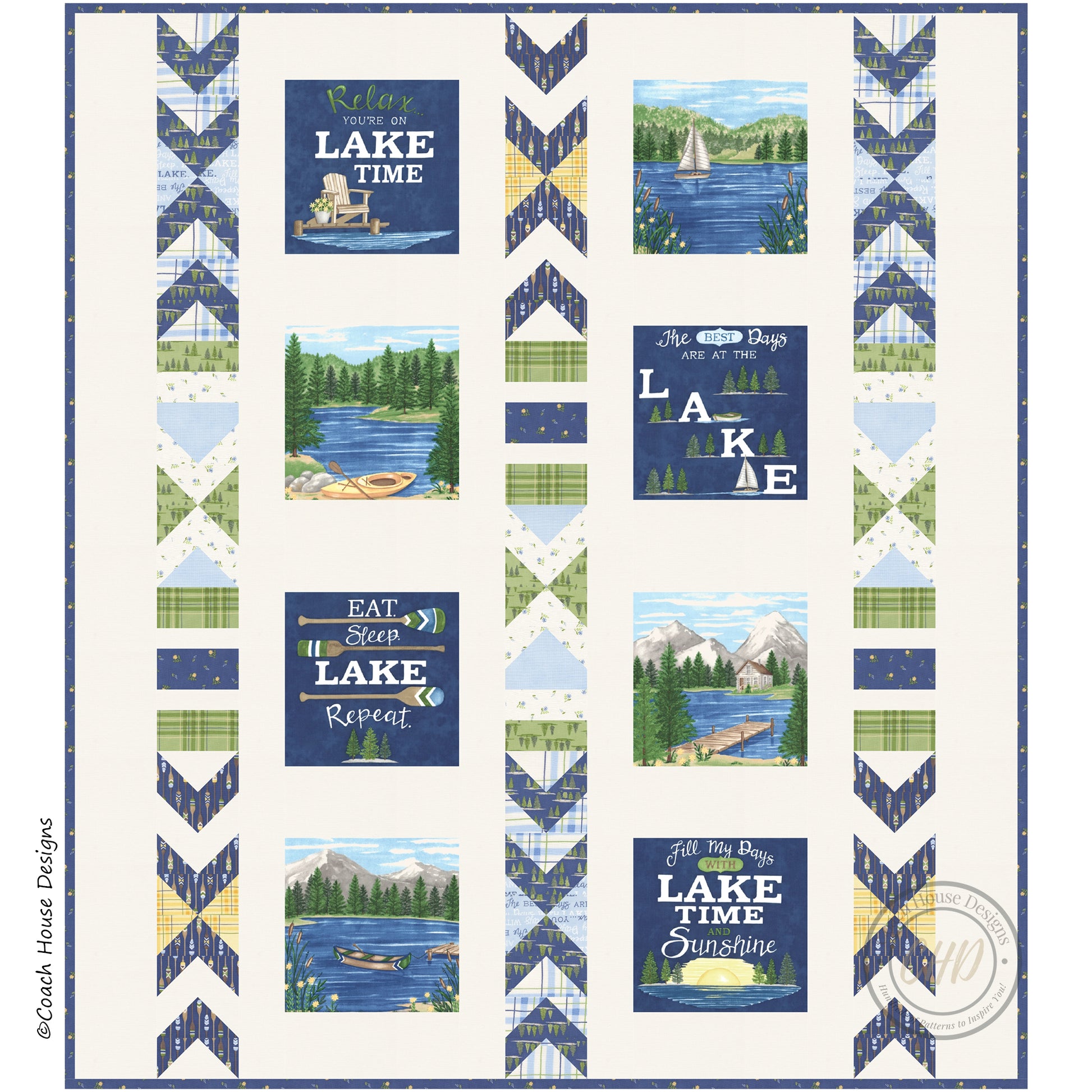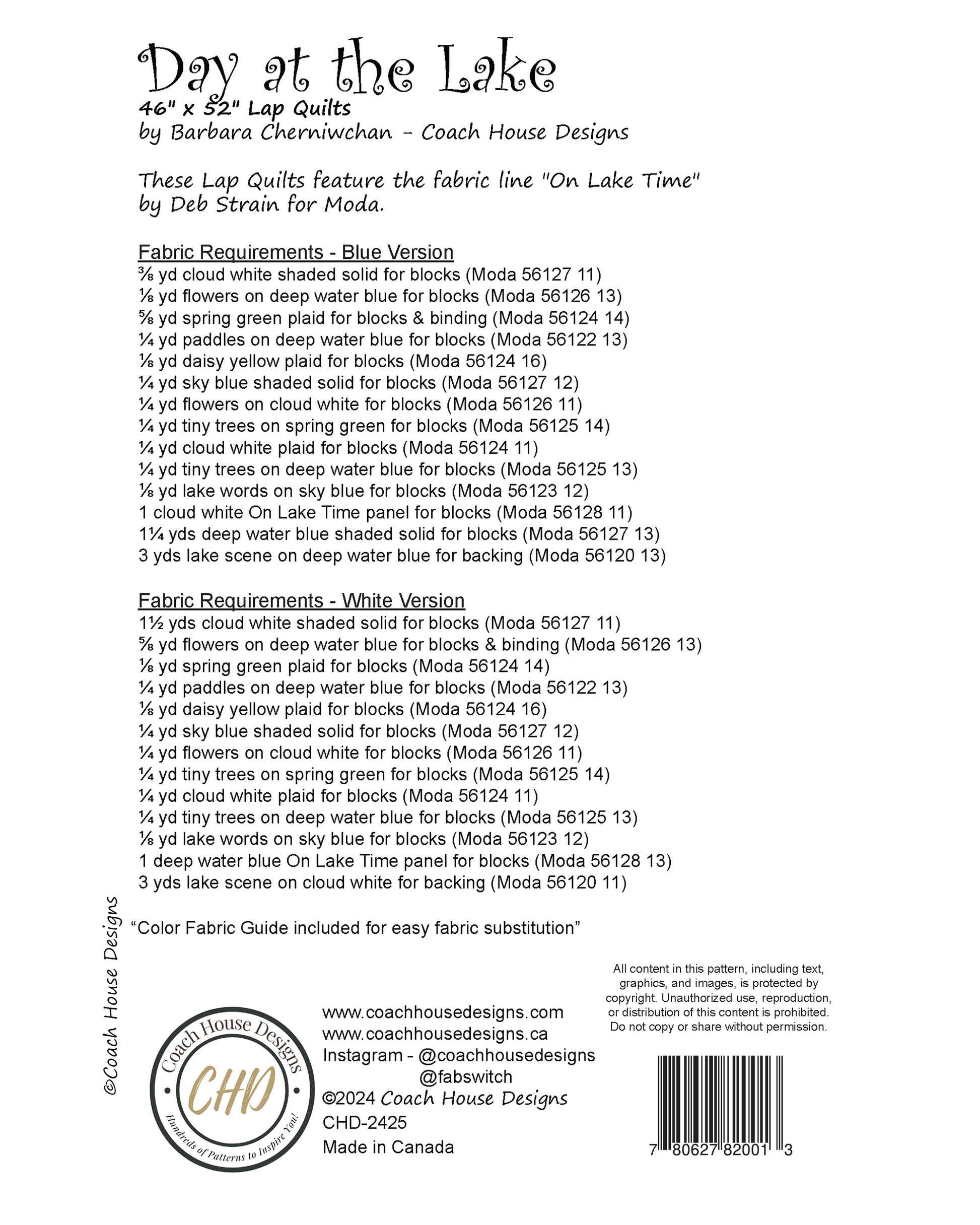 My dear friend Deb Strain has designed a new fabric collection inspired by her special trips and memories of lake days. Her beautiful artwork in the panels inspired my newest quilt pattern "Day at the Lake". Finishing at 46" x 52", this lap quilt pattern has instructions for both a Blue and a White version.