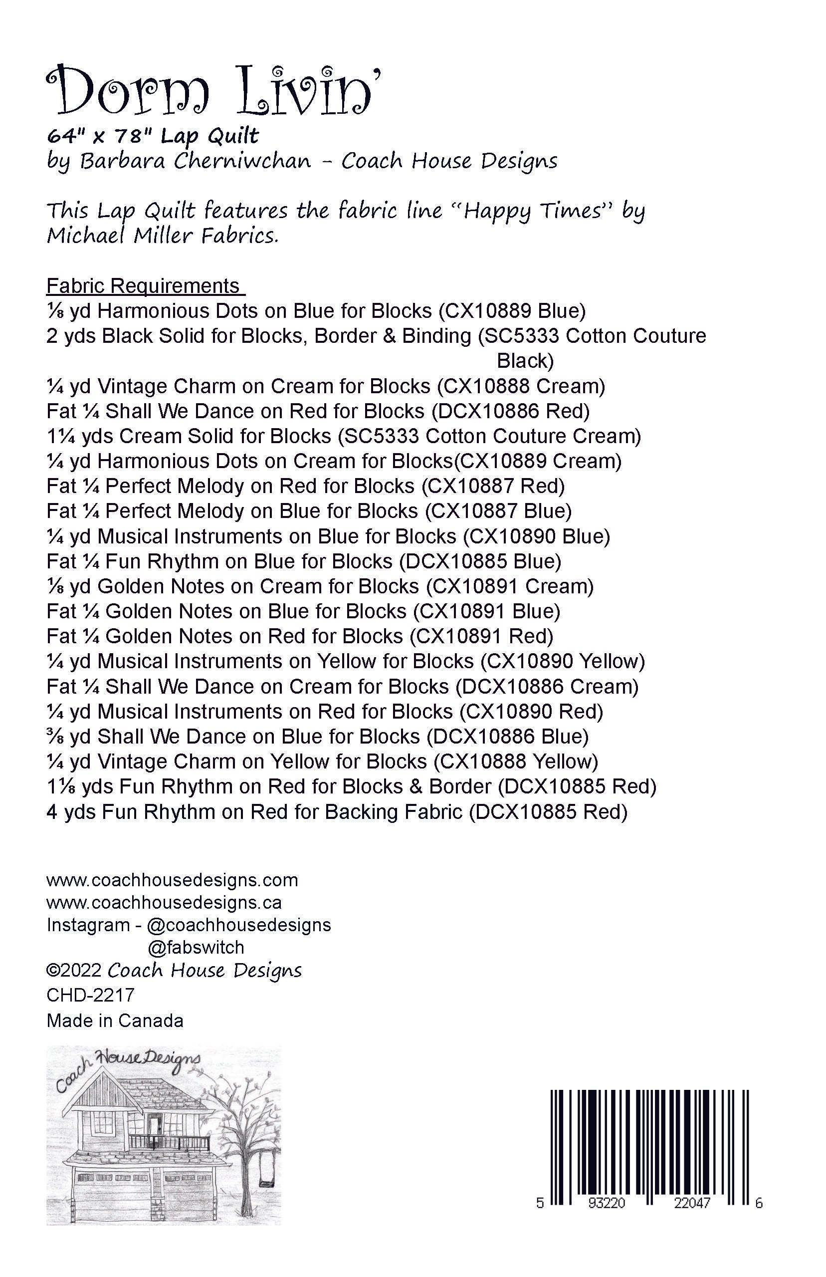 This 64" x 78" lap quilt features the fabric line "Happy Times" by Micahel Miller Fabrics. The pattern includes applique.