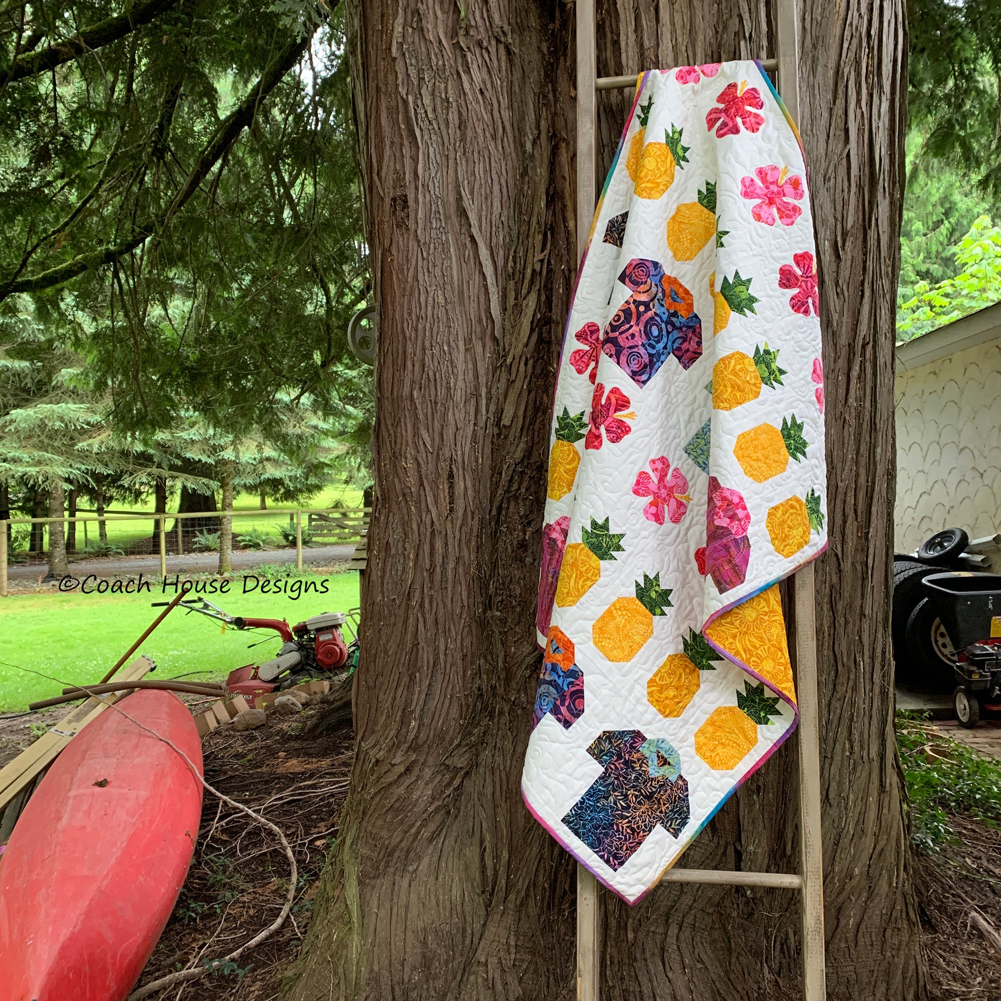 This fun summer lap quilt (48" x 57") features Aloha Batiks by Moda Fabrics. The Hibiscus flowers are appliqued but the rest is pieced. Fun to make and suitable for any fabrics.