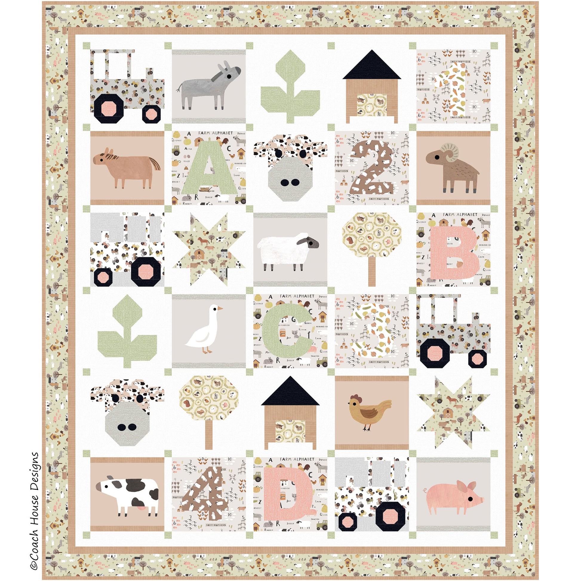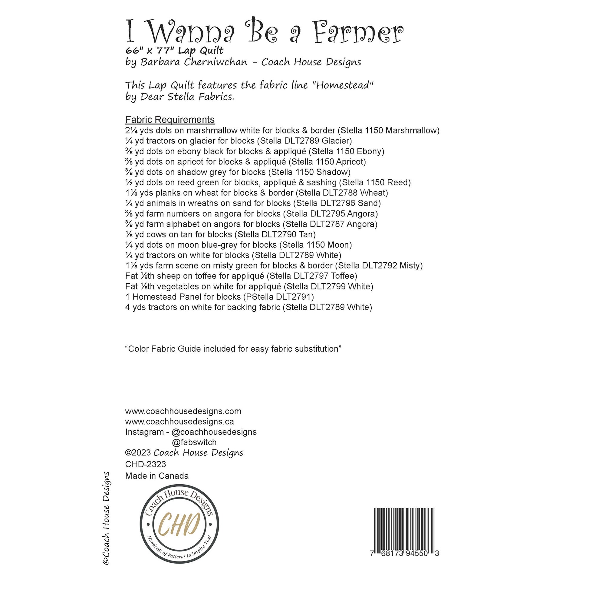 My pattern "I Wanna Be a Farmer" uses both the fabric and panels from the fabric line "Homestead" by Dear Stella Fabrics. It features a whimsical design, from adorable farm animals to all things farm life. The pattern uses both applique and piecing.