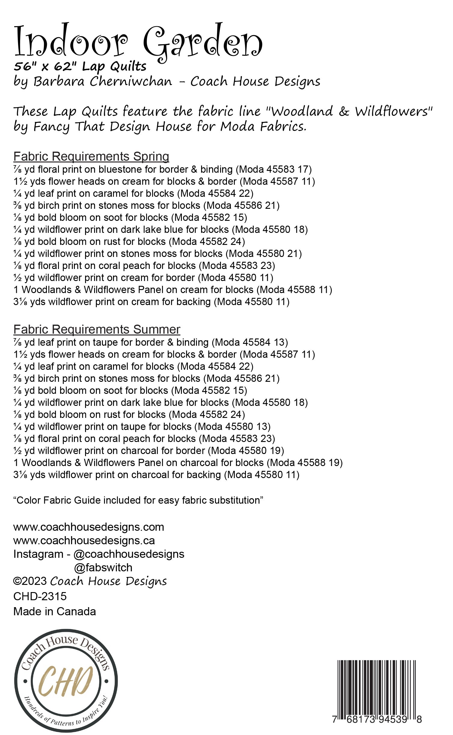 With soft florals and serene foliage, my new quilt pattern "Indoor Garden" brings the elegant charm of an outdoor garden, inside. The pattern includes instructions for a light (Spring) and dark (Summer) version. The lap quilt finishes at 56" x 62", and uses the large floral panel from the fabric line "Woodland & Wildflowers" by Fancy That Design House & Co. for Moda Fabrics.