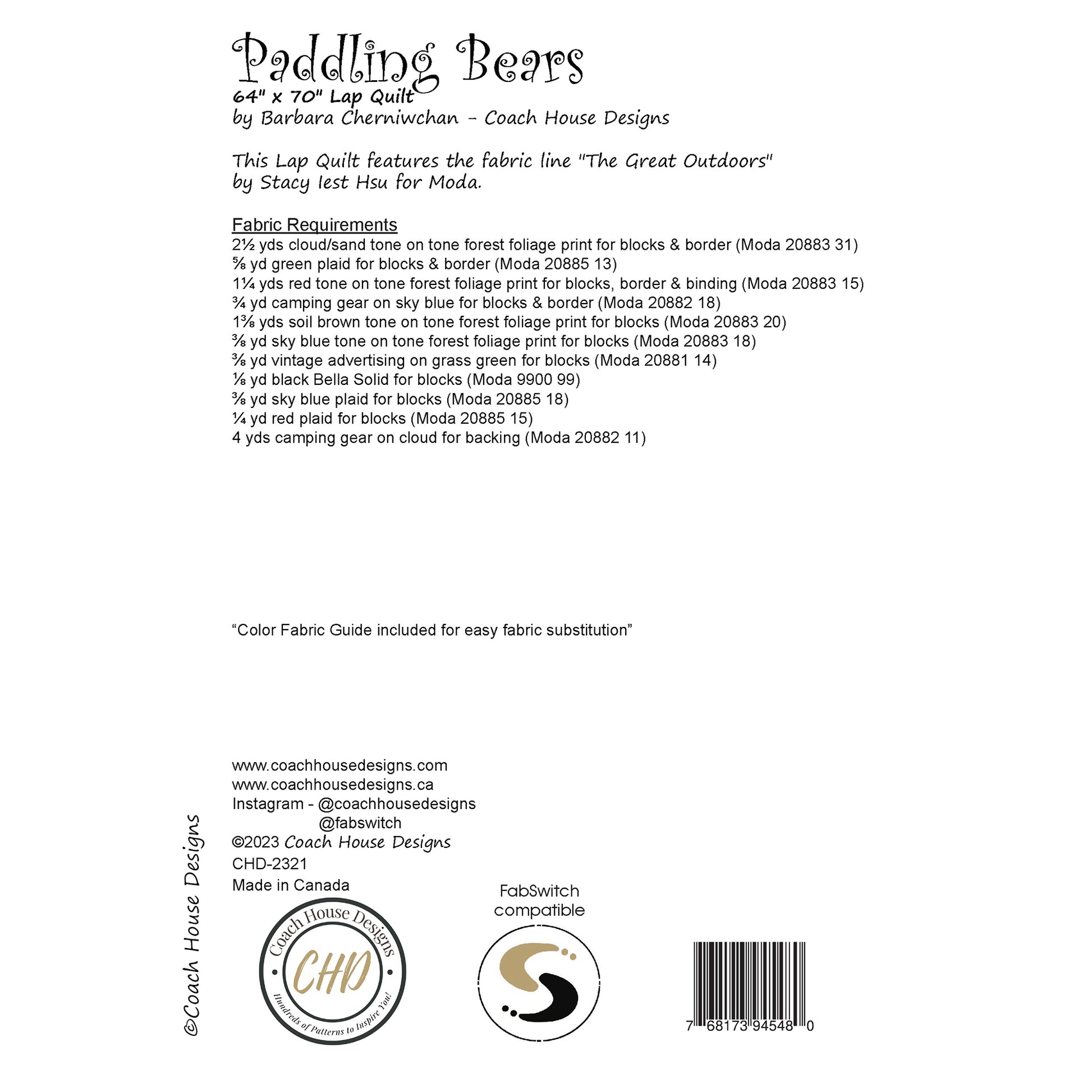 Finishing at 64" x 70", Paddling Bears features the fabric line "The Great Outdoors" by Stacy Iest Hsu for Moda. All piecing, no applique.