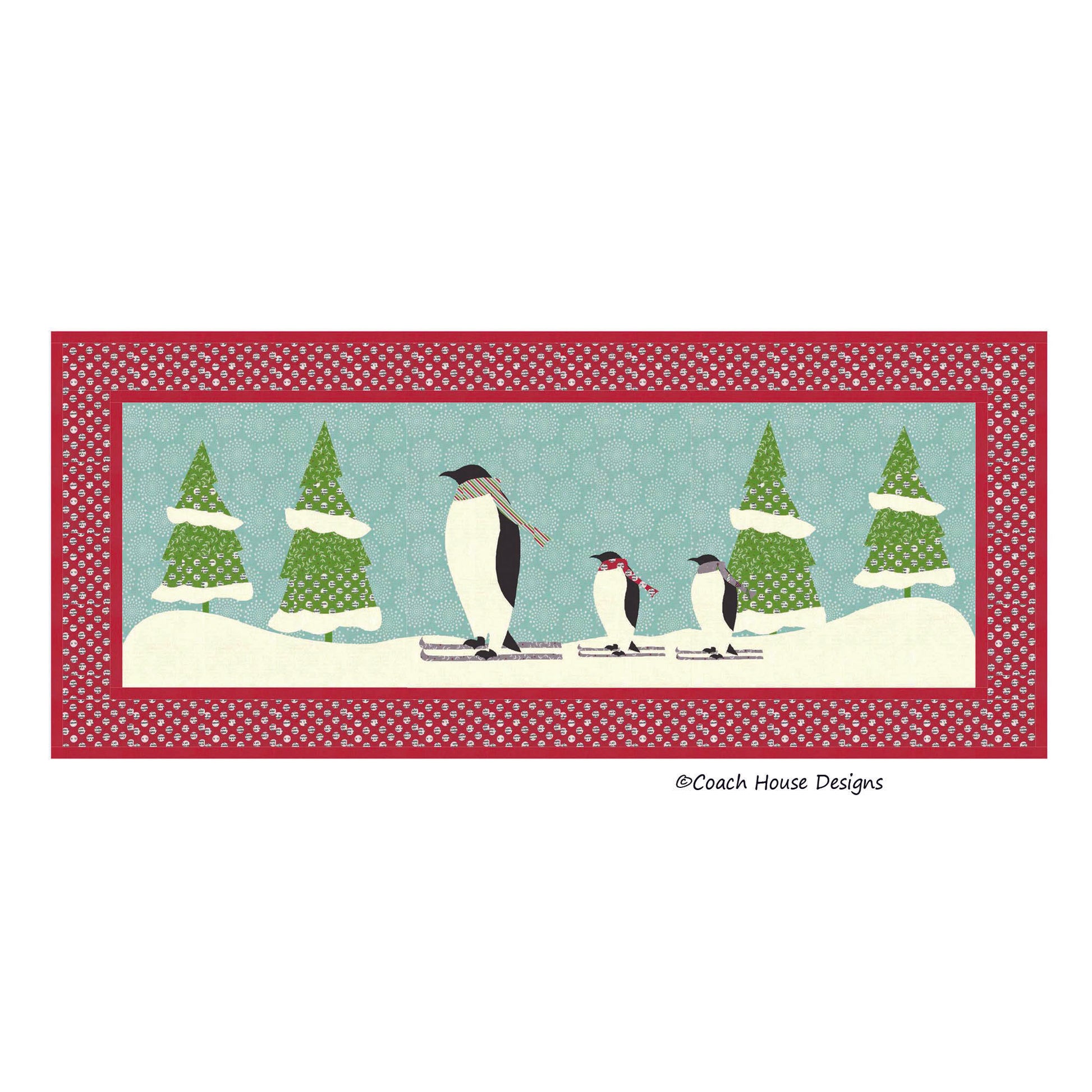 Not your traditional Winter table runner, these cute penguins on ski are a fun addition to your holiday decor. Table runner measures 41" x 17" and is shown in "Holly's Tree Farm" by Sweetwater. It would look cute in any winter/Christmas themed fabric.
