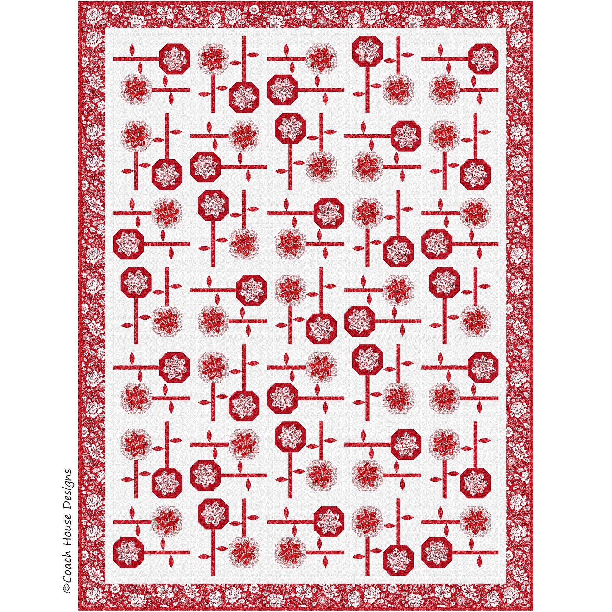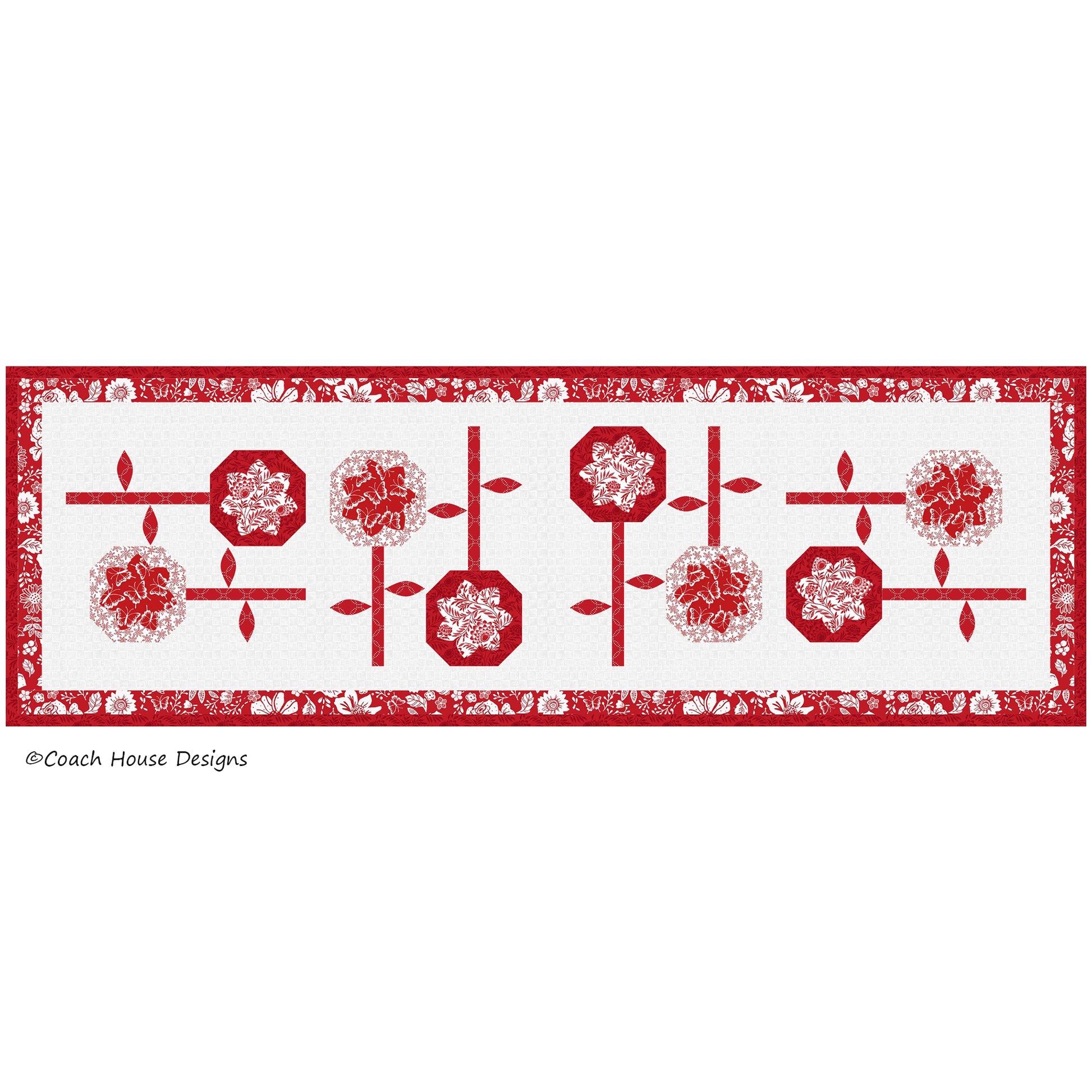 This pattern features the fabric line "Garden Redwork" by Timeless Treasures and includes instructions to make both a lap quilt (58" x 78") and a runner (44"x 14").