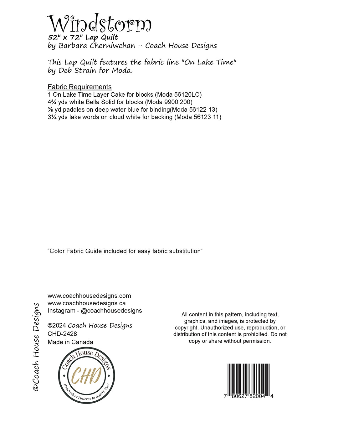 Finishing at 52" x 72", Windstorm uses the Layer Cake from Deb Strain's lake-themed fabric line "On Lake Time" for Moda Fabrics.