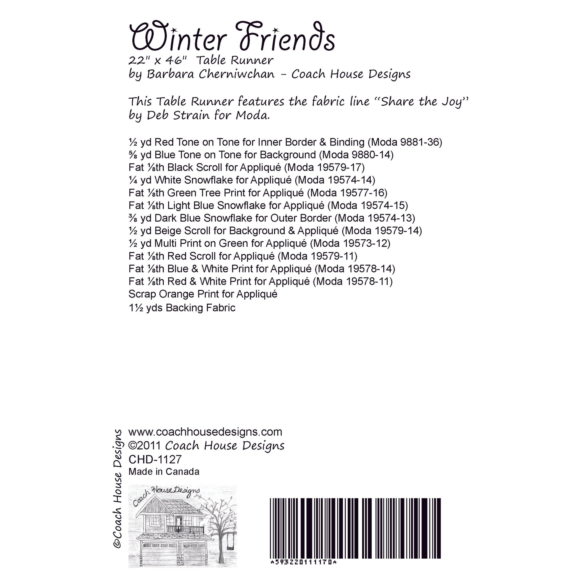 This 22" x 46" table runner features "Share the Joy" by Deb Strain. The fabric was released in 2012 but it would look cute in any current Christmas fabric.
