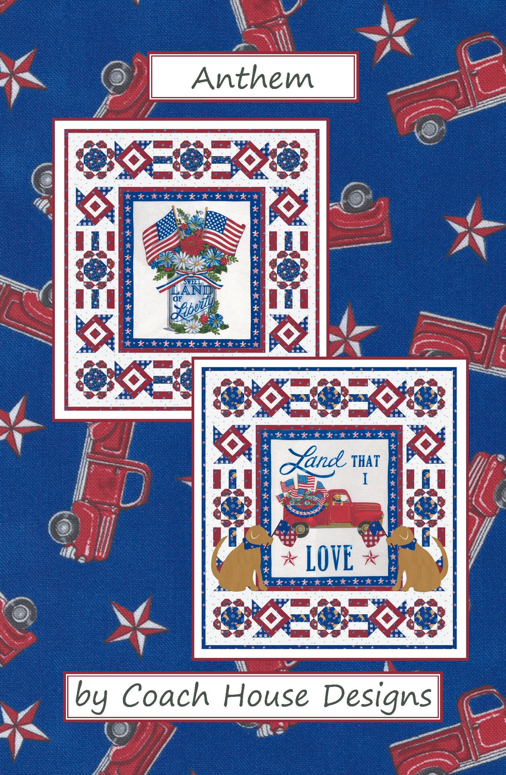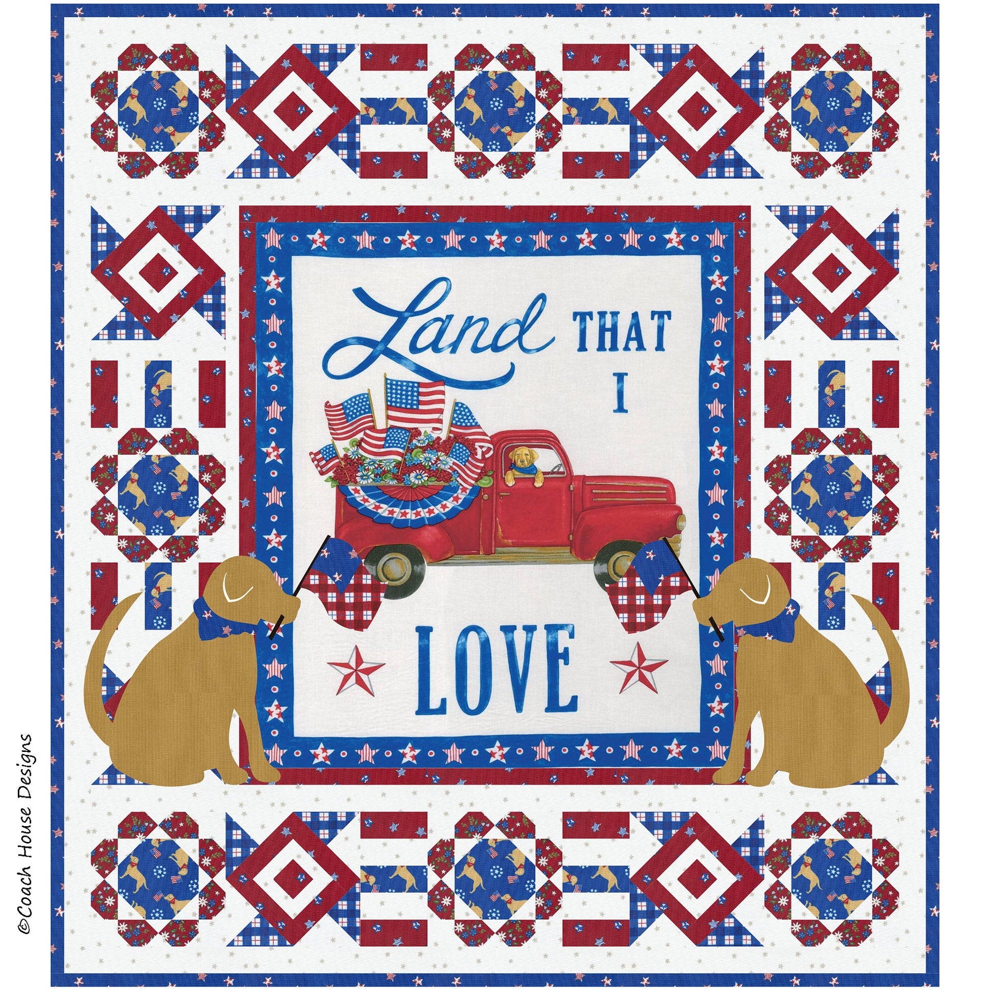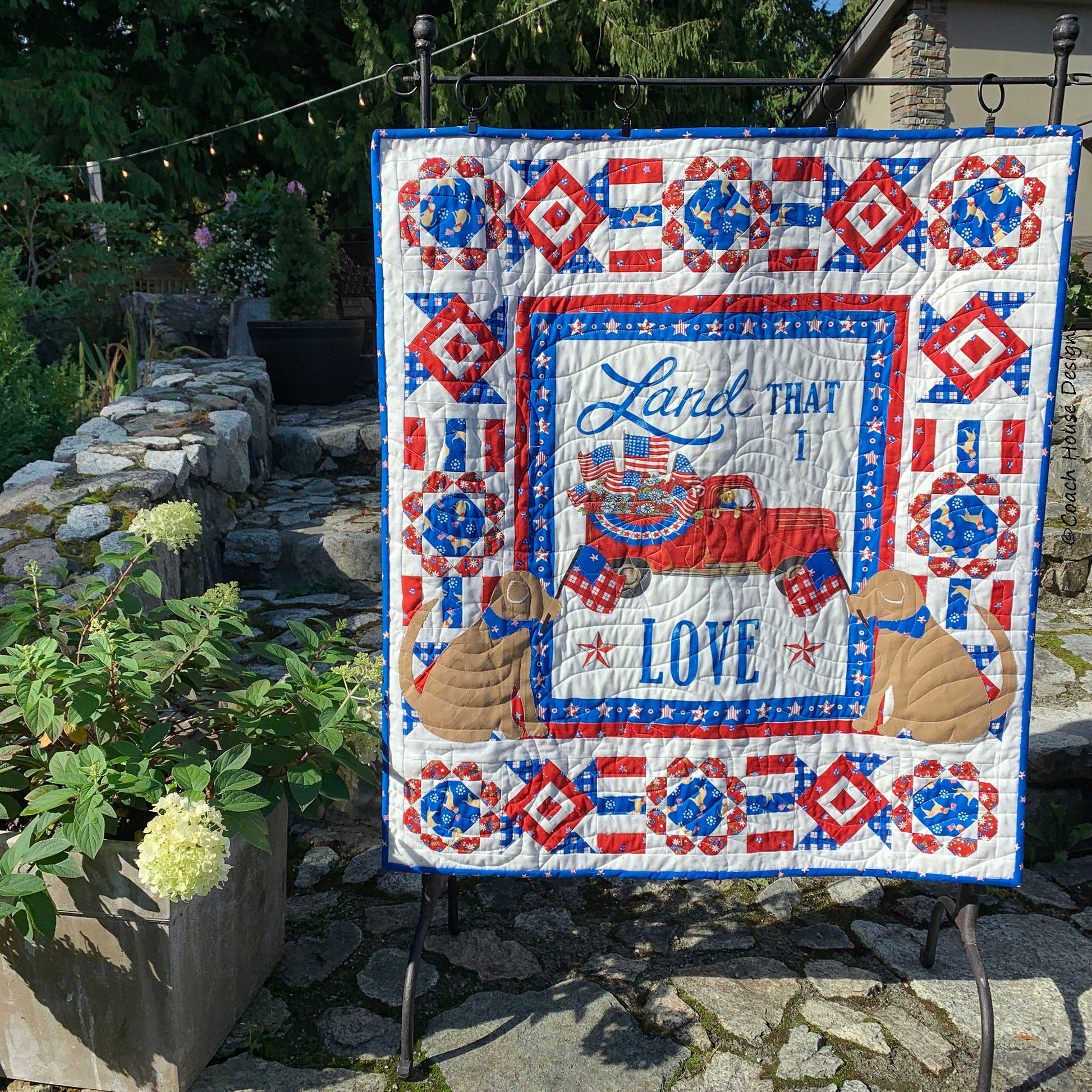 These two Americana 32" x 35 1/2" wall quilts are made with one "All American" panel and yardage by Deb Strain for Moda. Sweet Land of Liberty is all piecing and Land That I Love is embellished with adorable golden labs waiving the American Flag. The pattern is available now and the fabric which features trucks, flags and black and golden labrador retrievers will be in stores in March 2022.