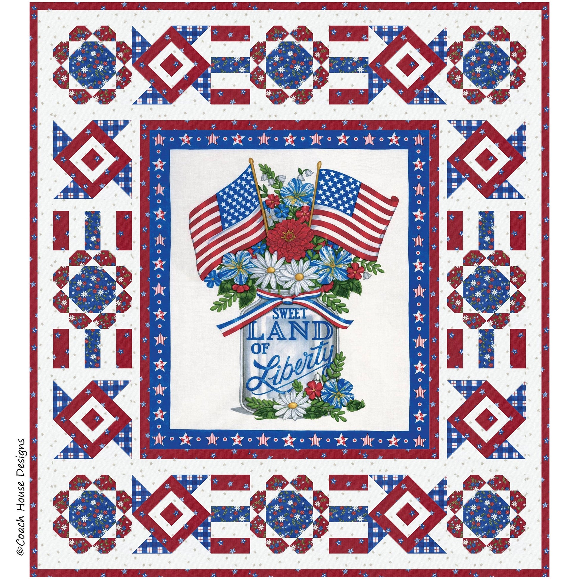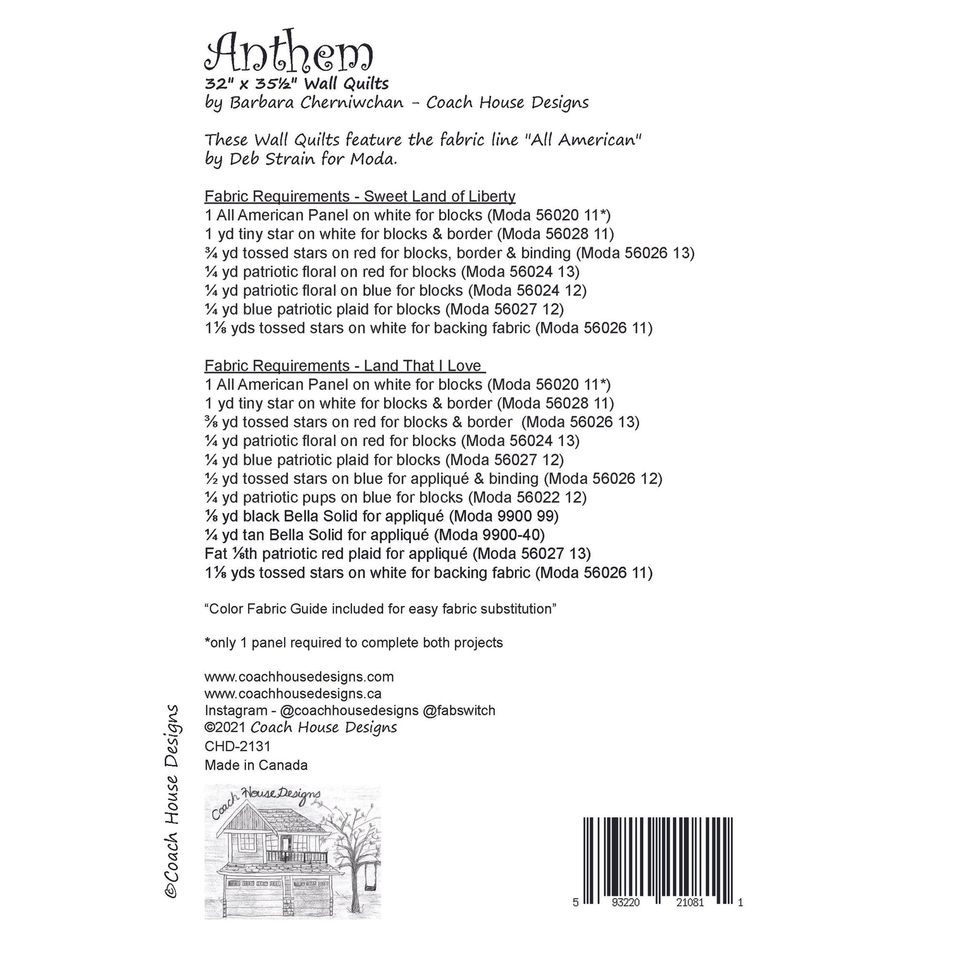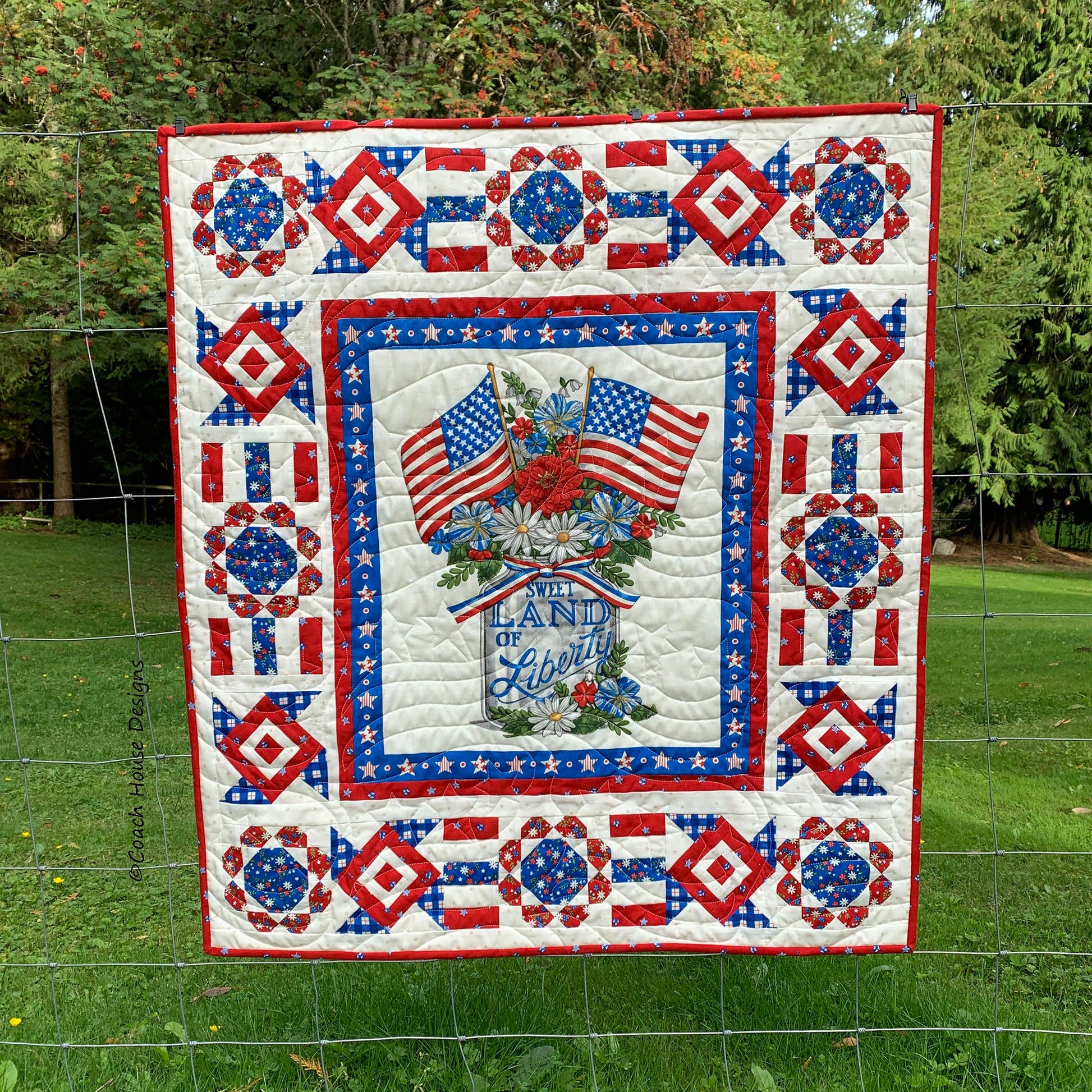 These two Americana 32" x 35 1/2" wall quilts are made with one "All American" panel and yardage by Deb Strain for Moda. Sweet Land of Liberty is all piecing and Land That I Love is embellished with adorable golden labs waiving the American Flag. The pattern is available now and the fabric which features trucks, flags and black and golden labrador retrievers will be in stores in March 2022.