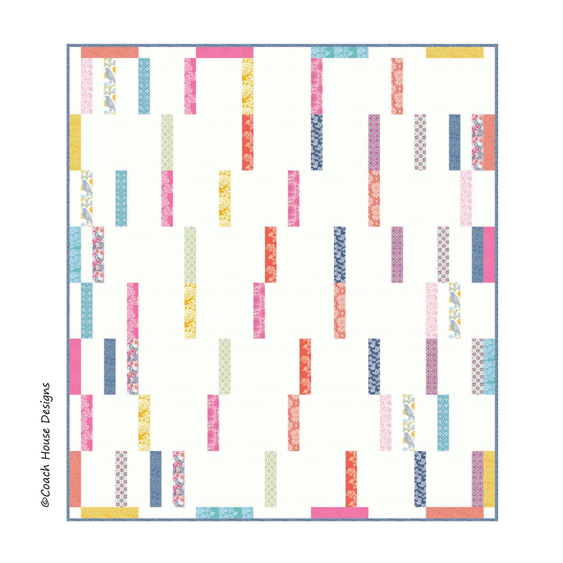 Easy to piece and made with a jelly roll, this pattern features "Early Bird" by Kate Spain. Perfect project for that Jelly Roll or 2 1/2" strip roll sitting on your shelf! Lap Quilt measures 74" x 84".