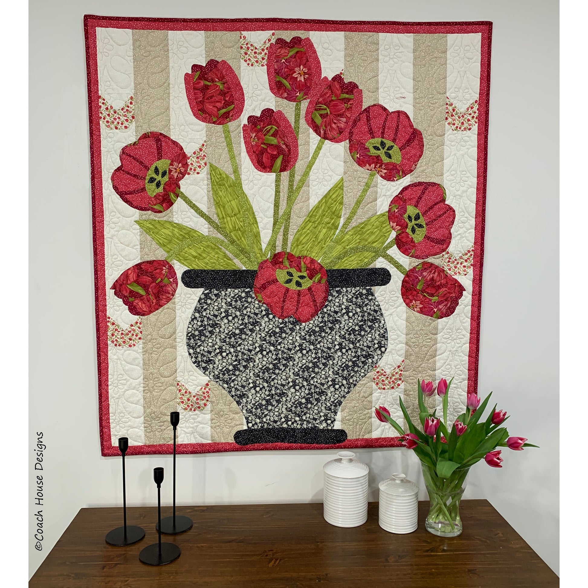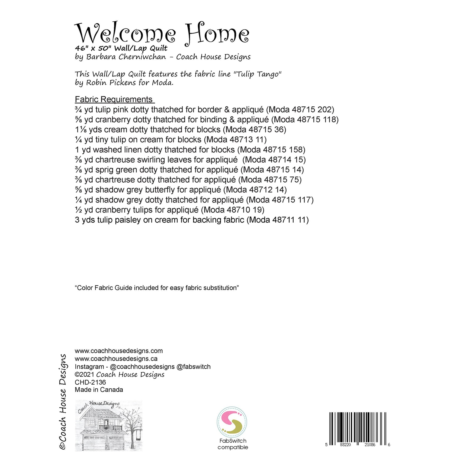 Nothing pulls me out of the winter doldrums more than a bouquet of fresh tulips! With this quilt pattern, you can have them all year round. Welcome Home is a 46" x 50" wall quilt and features Tulip Tango by Robin Pickens. Not for the feint of heart, this pattern has lots of applique. Most of the pieces are large but the detail shapes on the edge of the open tulips are smaller. The pattern includes tips for preparing and placing the applique shapes. Definitely in the top ten of my favorite patterns.