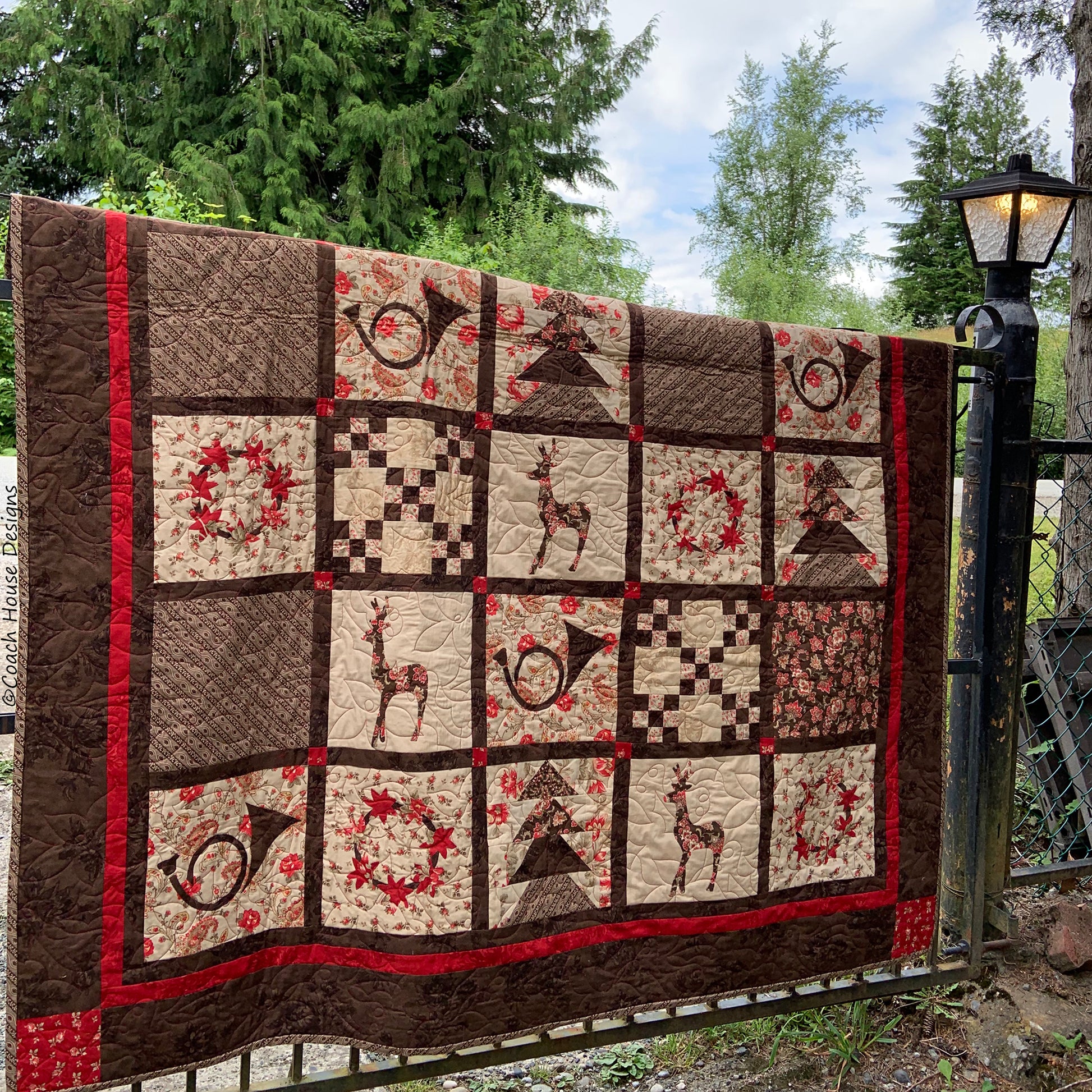 This Christmas Sampler quilt measures 61" x 81". Shown in 3 Sisters from 2011, this quilt would be beautiful in traditional red and green fabrics as well.