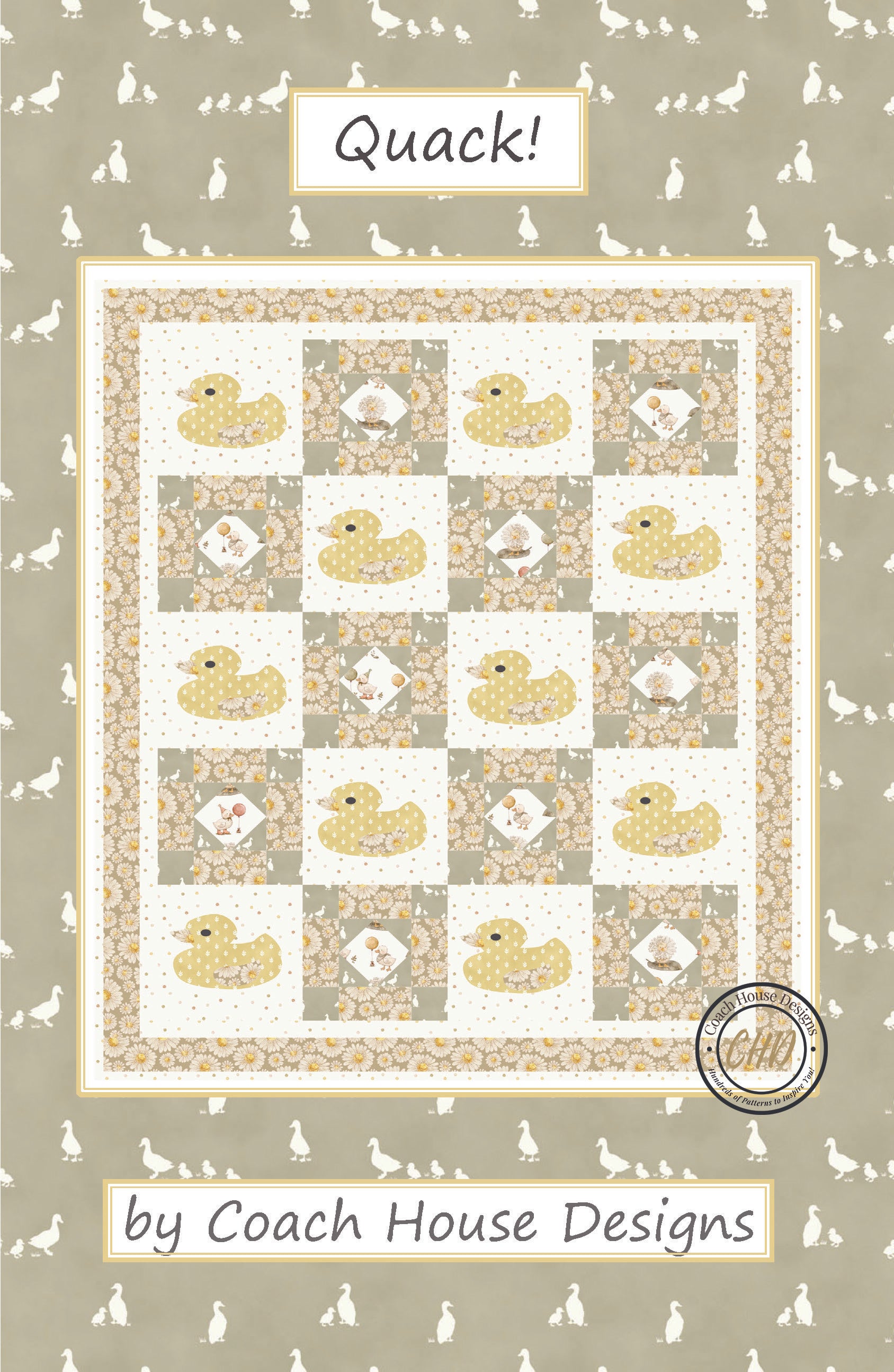 This 38" x 46" baby quilt pattern is a re-color of a previous pattern. Unlike the first version, the Tiny Waddles fabric by Jessica Yon Lo features a soft palette o adorable fabrics in yellows, golds, cream and taupe. The rubber ducky motifs are appliqued but the rest of the quilt is simple piecing. This project would definitely become a keepsake.