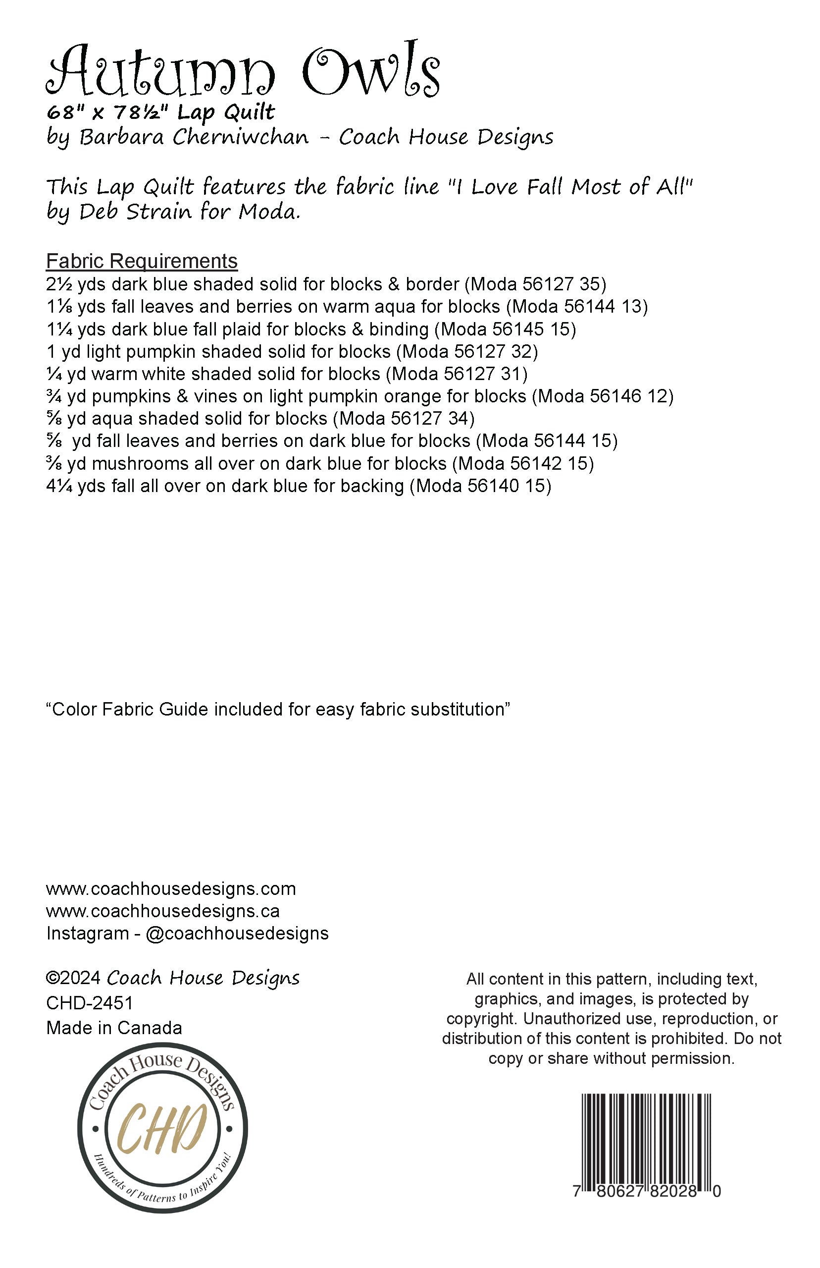 Using the I Love Fall Most of All fabric line by Deb Strain for Moda Fabrics, Autumn Owls combines rich tones of orange, aqua, and dark blue, bringing a warm and inviting feeling to any space. This quilt is all pieced, with no applique, making it a perfect project for quilters who love precision and beautiful detail.