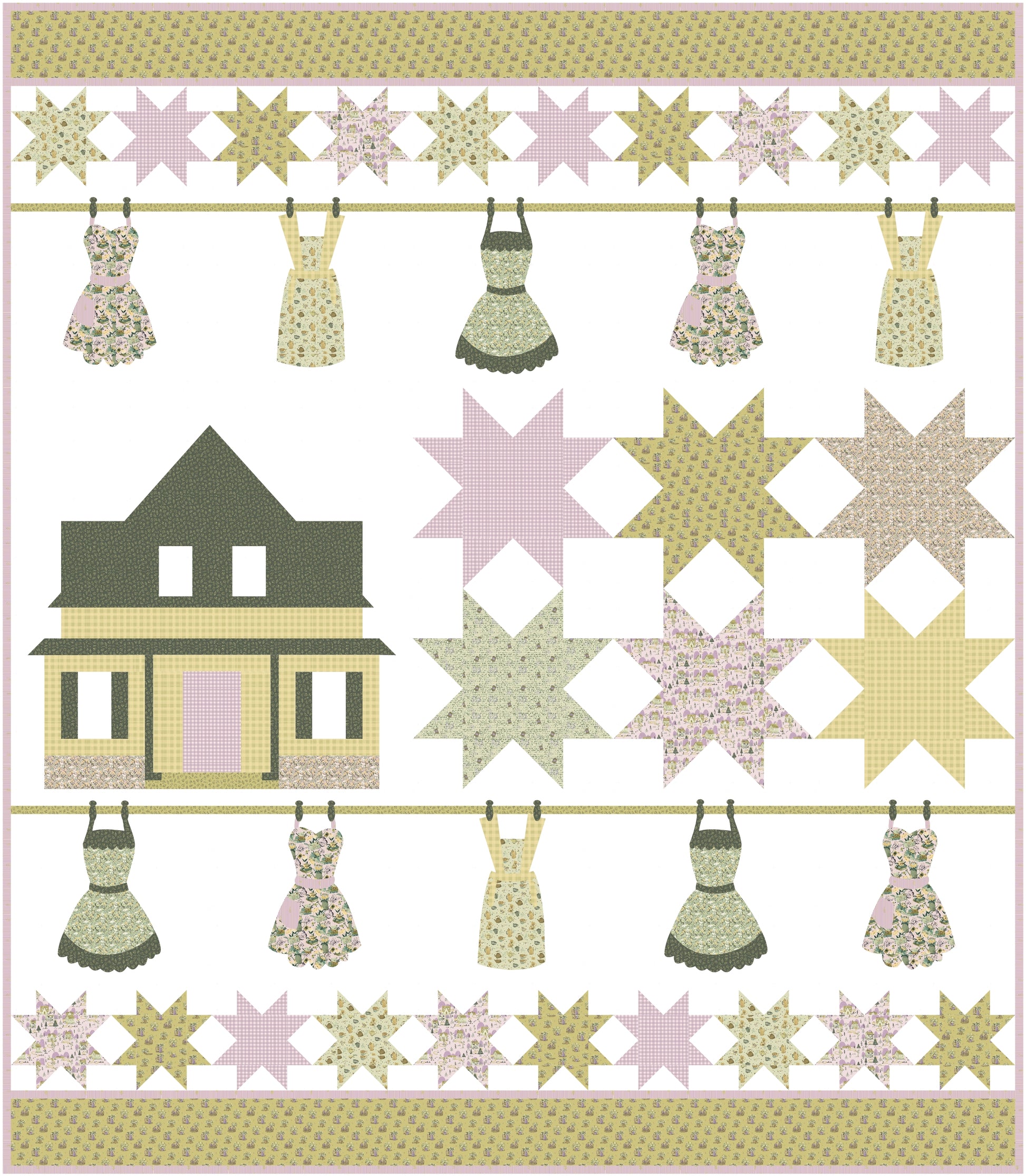 At the heart of this 60" x 69" lap quilt is a charming farmhouse block, flanked by whimsical appliquéd aprons swaying gently on a clothesline—an homage to the pioneer spirit and the daily rhythms of rural life. Overhead, twinkling stars scatter across the quilt top, a reminder of the breathtaking night skies visible only far from city lights.