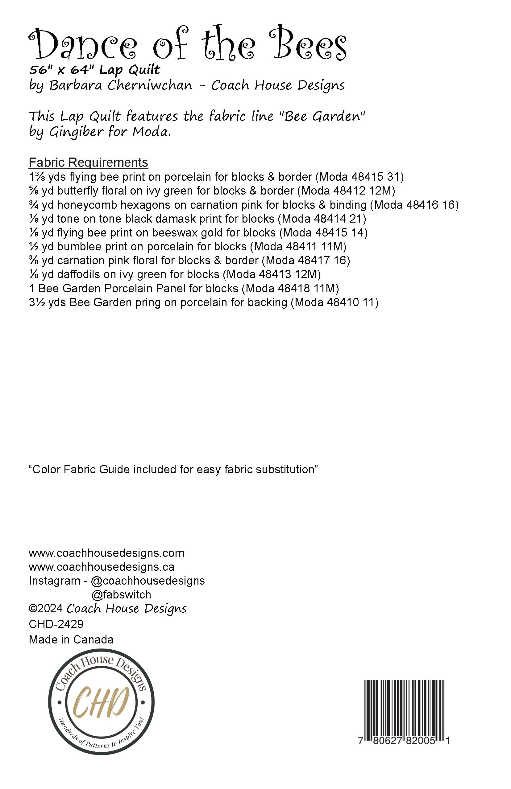 Are you looking for your next quilt project to keep you buzzy? Bee-inspired with my new quilt pattern, "Dance of the Bees". Finishing at 56" x 64", the pattern features the panel and fabric from Gingiber's new fabric line "Bee Garden" for Moda Fabrics.