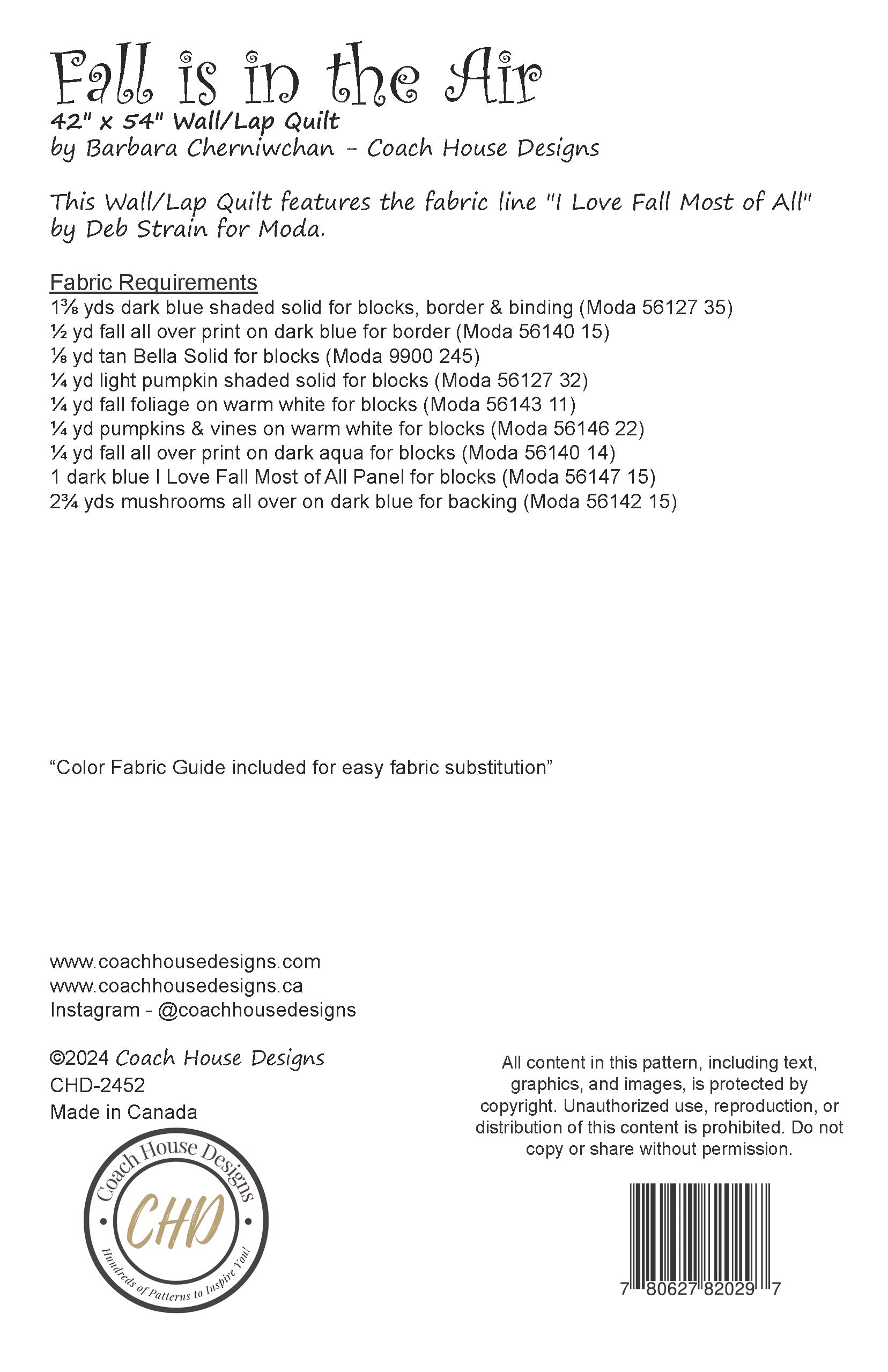 Celebrate the beauty of autumn with Fall is in the Air, a stunning quilt pattern featuring the "I Love Fall Most of All" fabric collection by Deb Strain for Moda Fabrics. This cozy 42” x 54” quilt highlights a breathtaking autumn panel framed by charming star and pumpkin blocks, creating a warm and inviting seasonal design. Perfect for showcasing the rich hues of autumn, this pattern is ideal for both beginner and experienced quilters alike.