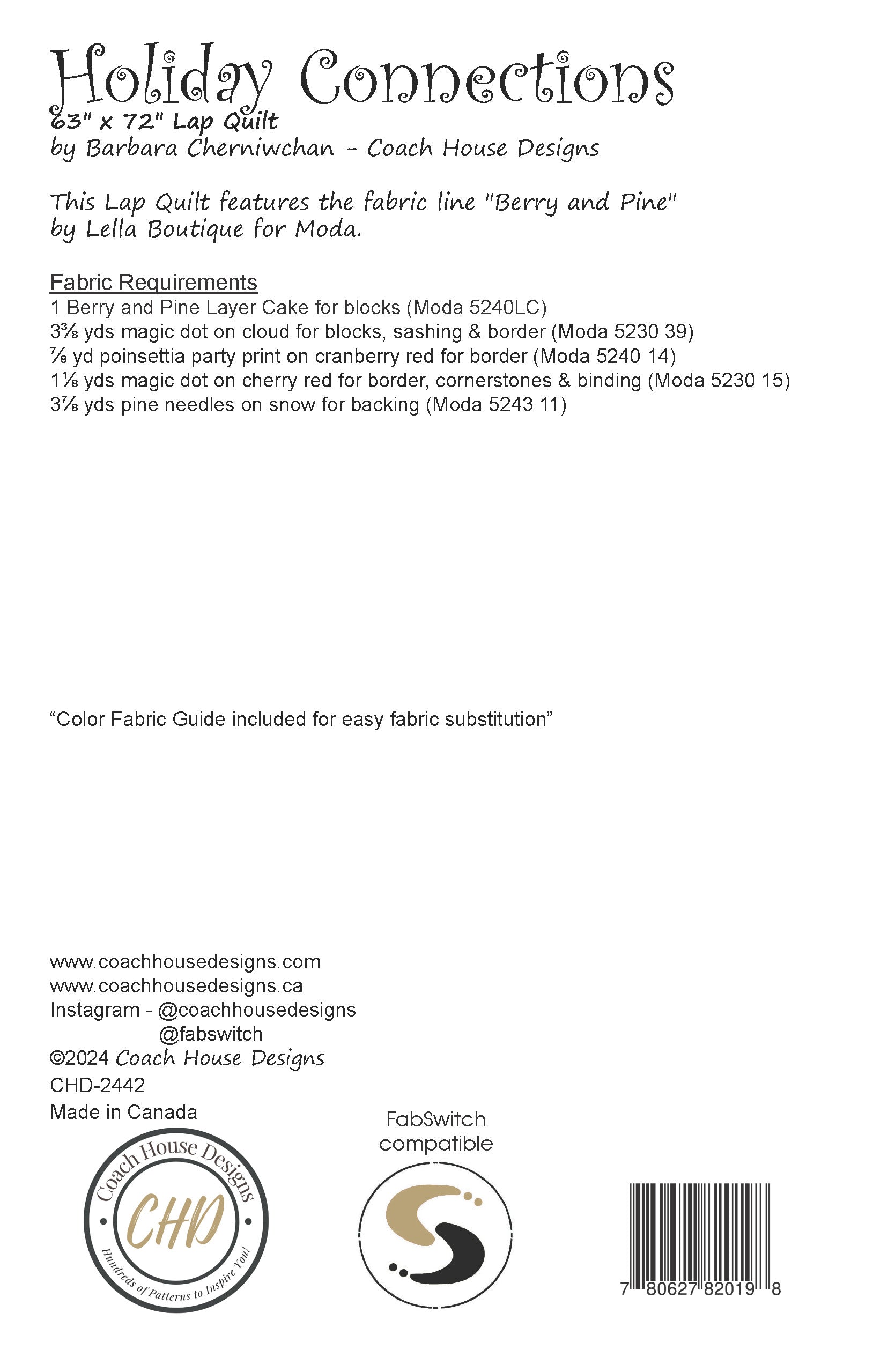 Have a quilty little Christmas this holiday season with my newest pattern "Holiday Connections". This festive 63" x 72" lap quilt features the fabric line "Berry and Pine" by Lella Boutique for Moda Fabrics. The pattern uses a a layer cake, and is the perfect addition to your holiday decor!