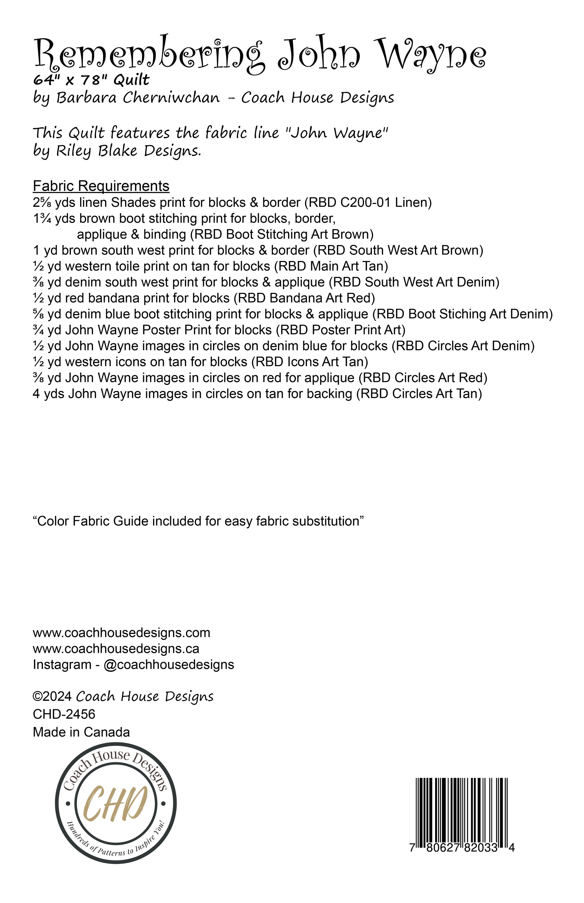 Celebrate the timeless spirit of the American West with the "Remembering John Wayne" lap quilt. Measuring 64" x 78", this beautifully crafted quilt pays tribute to the legendary cowboy and Hollywood icon. Designed with fabrics from the "John Wayne American West" collection by Riley Blake Fabrics, it features rugged western motifs, including denim textures, bold stripes, and imagery of the open range.