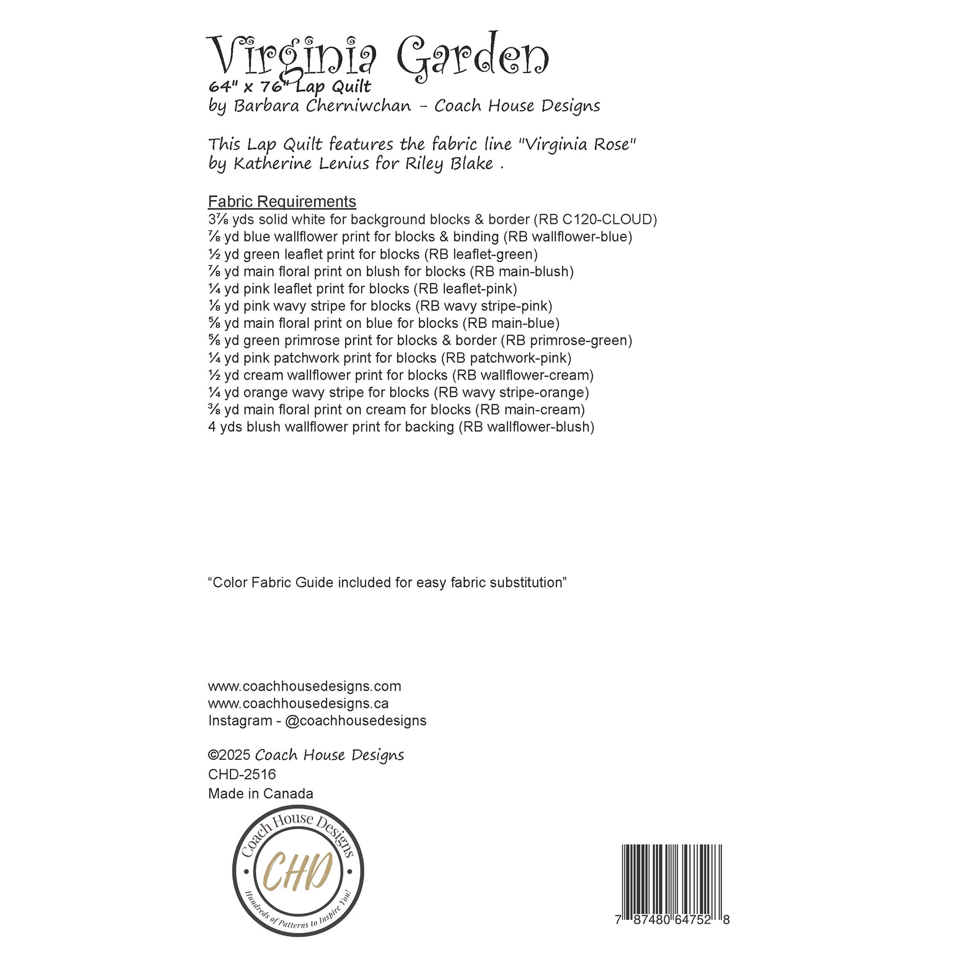 Inspired by the blossoming "Virginia Rose" fabric collection by Katherine Lenius for Riley Blake Designs, Virginia Garden pairs especially well with rose prints, delicate vines, or vintage-inspired florals. Whether you sew it up in "Virginia Rose" or mix in your favourite floral stash, this timeless pattern will shine.