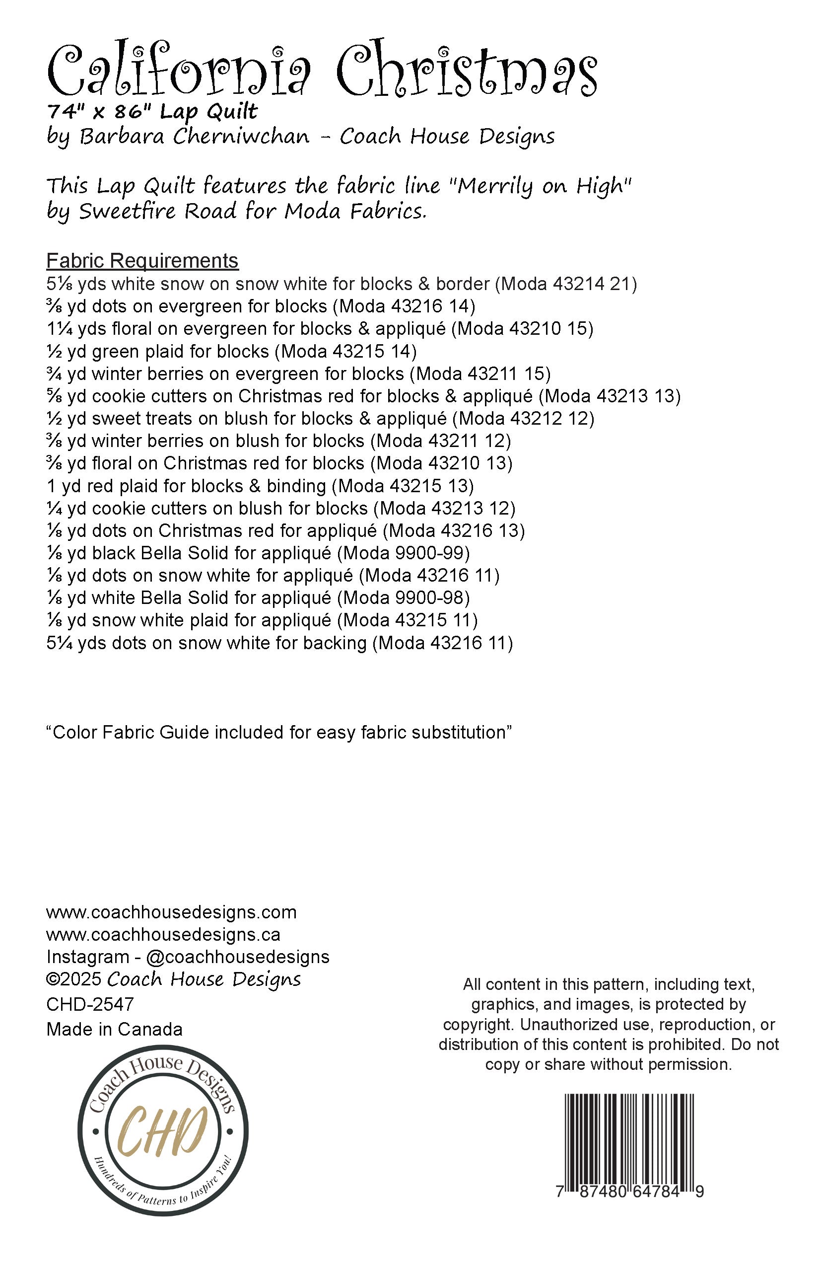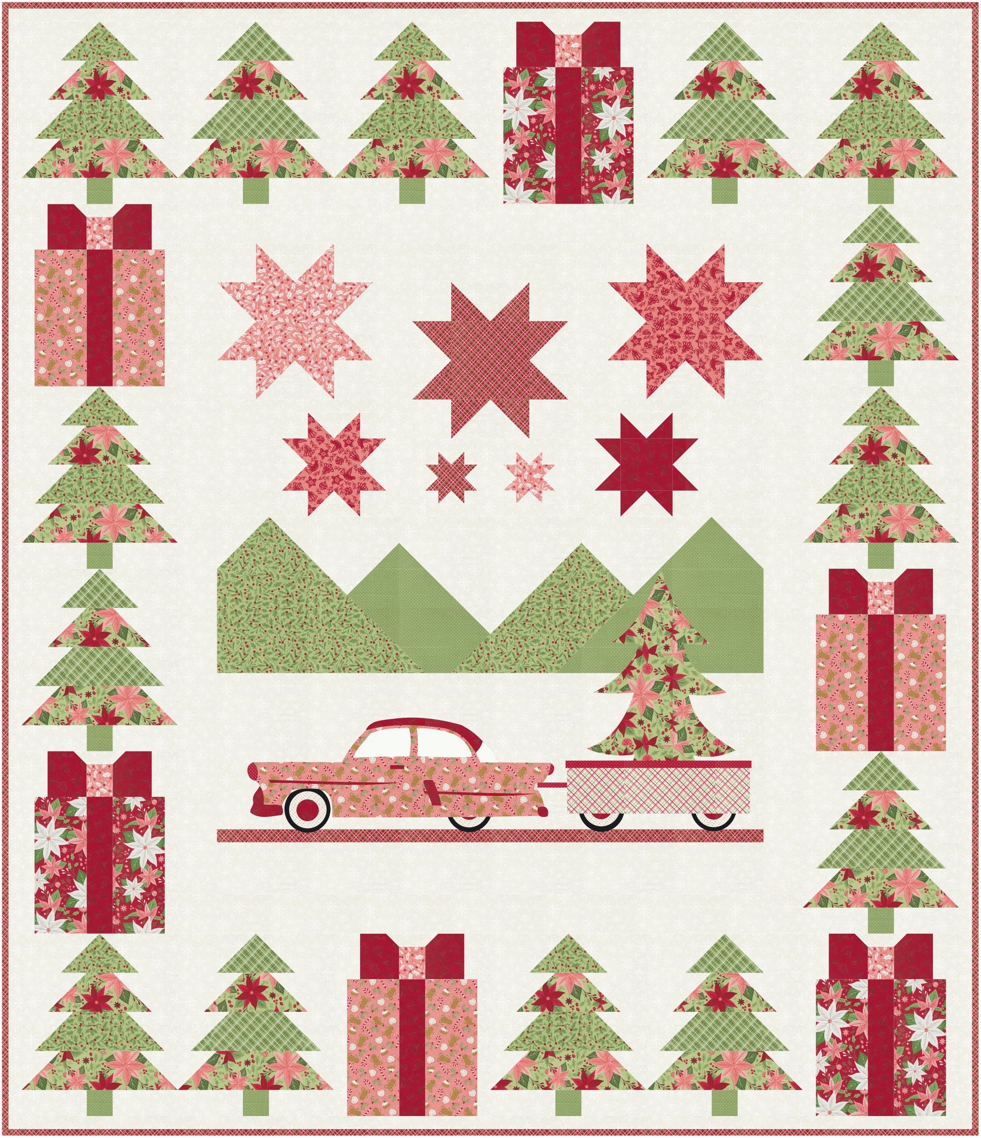 Bring a touch of retro sunshine to your holiday season with California Christmas, a nostalgic quilt pattern that blends 1950s charm with festive cheer. Finishing at 74" x 86", this eye-catching design captures a vintage Christmas scene through a delightful mix of appliqué and piecing, making it a true showstopper for your winter décor.