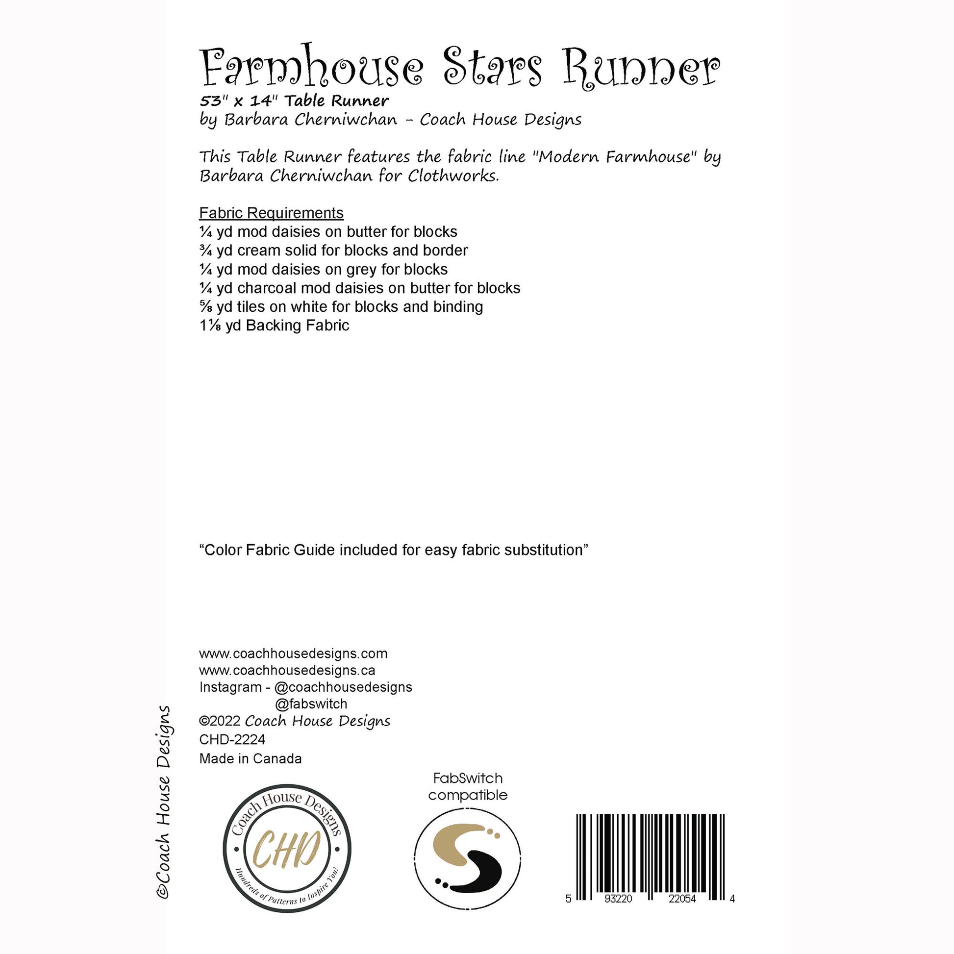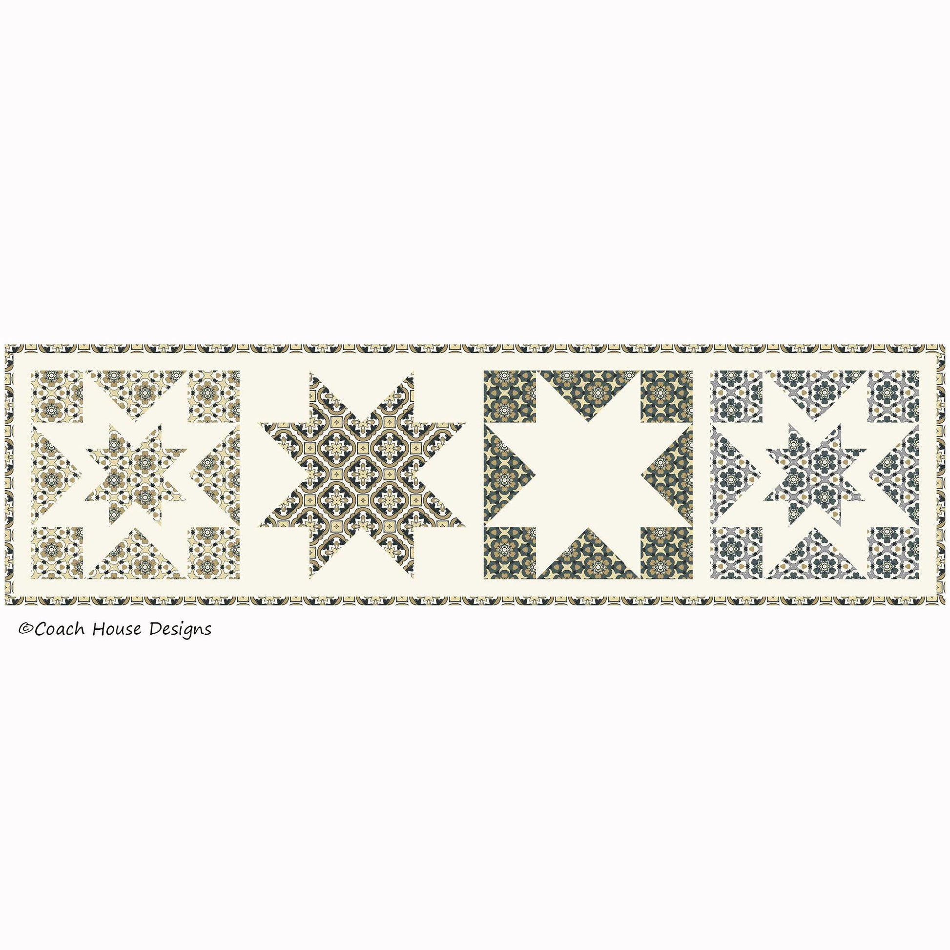 Quick and easy 53" x 14" star table runner featuring Modern Farmhouse fabrics by Barb Cherniwchan. Traditional pattern with a modern vibe. Kit includes fabric for top and binding. Only a few available so don't delay.
