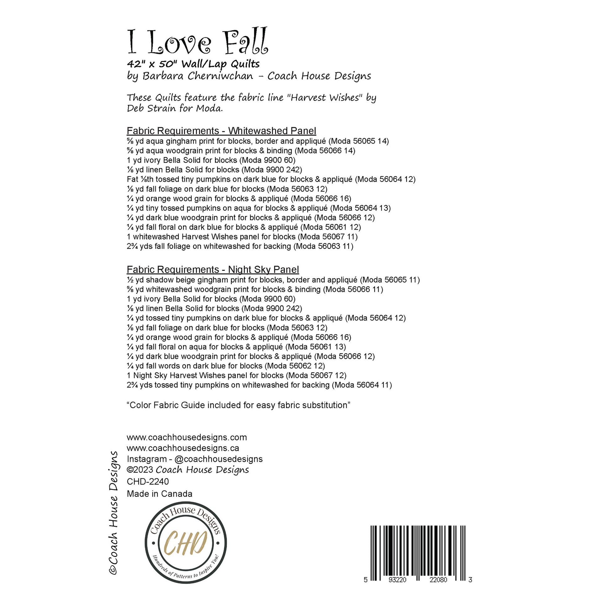 I Love Fall measures 42" x 50" and features instructions to make a wall/lap quilt in 2 color ways using the whitewashed or night sky panel from Deb Strain's upcoming fabric line "Harvest Wishes". All piecing except the pumpkin leaves and tendrils which are appliqued. The pattern is available now and the fabric will be available in April 2023.