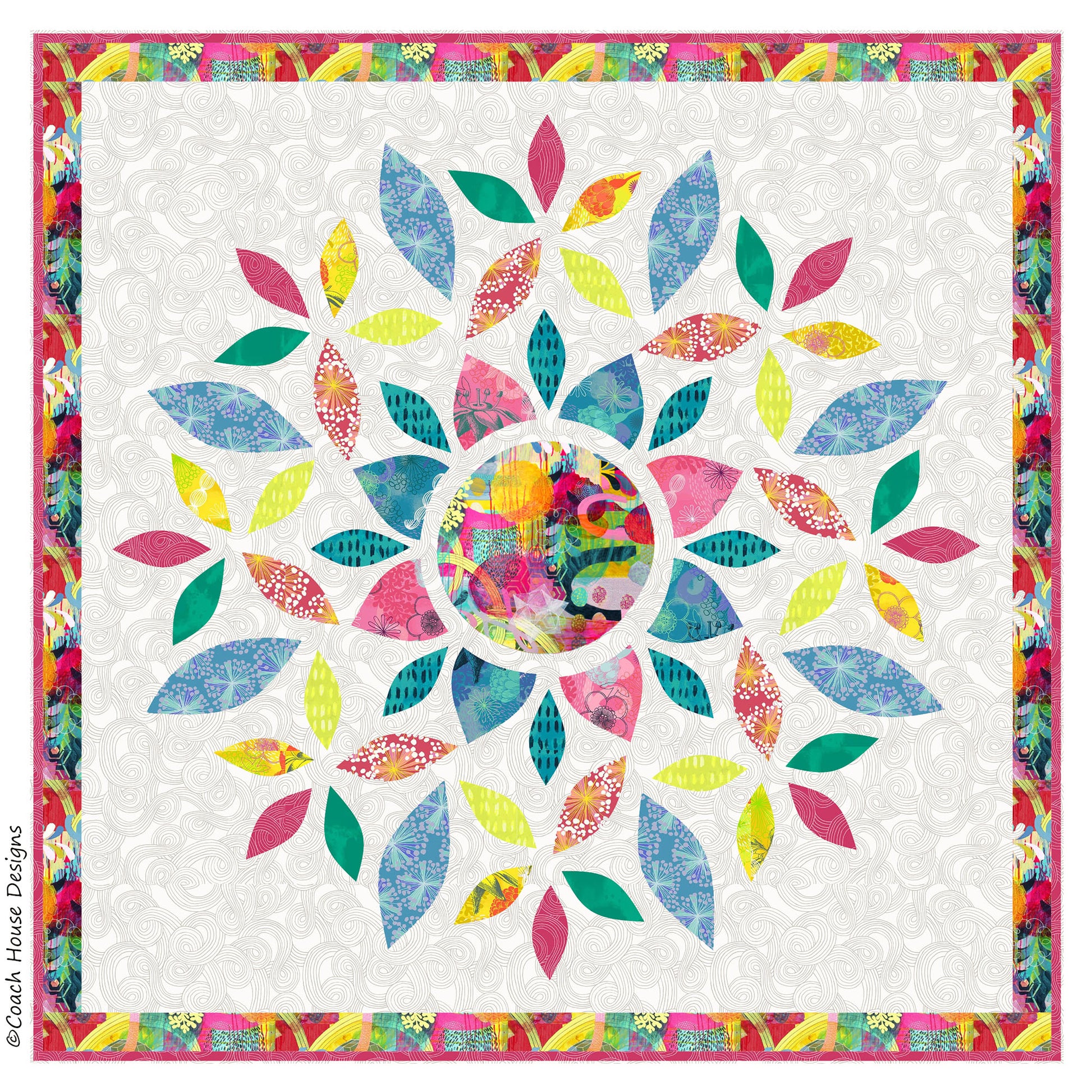 This 52" square appliqued medallion wall quilt features Bright World by Sharon Virtue. The vibrant colors in these modern prints make a beautiful statement. This would definitely be a treasured art piece in your home. Fabric will be available in April 2023 and the pattern is available now.