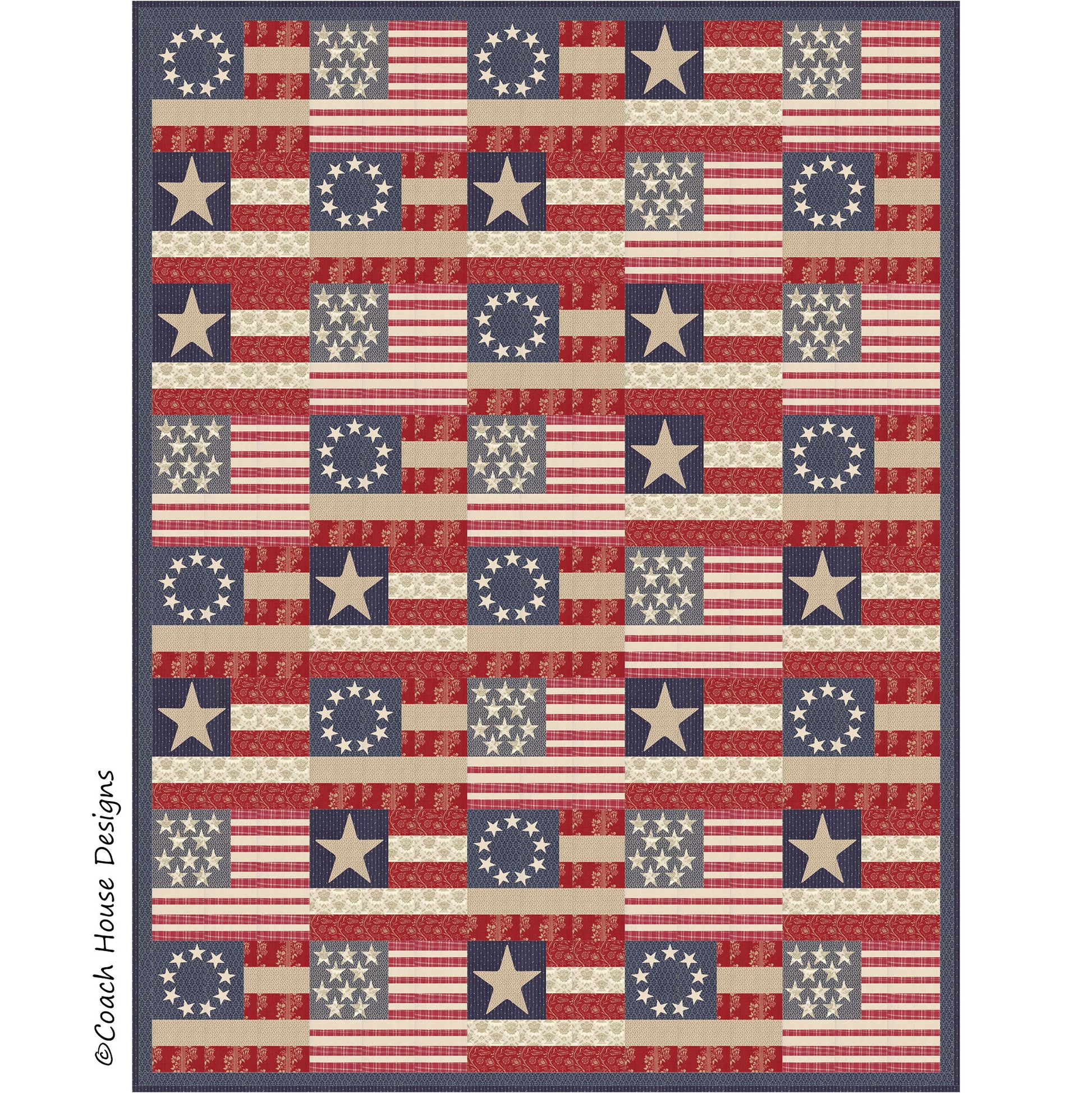 This patriotic lap quilt (66" x 82") features "Vive La France" by French General. These fabrics give the quilt a vintage feel. Simple piecing with (a lot of) appliqued stars.