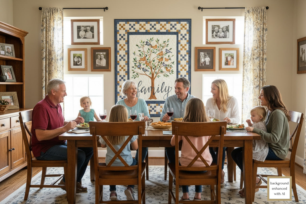Choose from two inspiring options: create a traditionally pieced version, or personalize your quilt with appliqued birds to represent beloved family members—a touching way to celebrate those who make your tree complete.