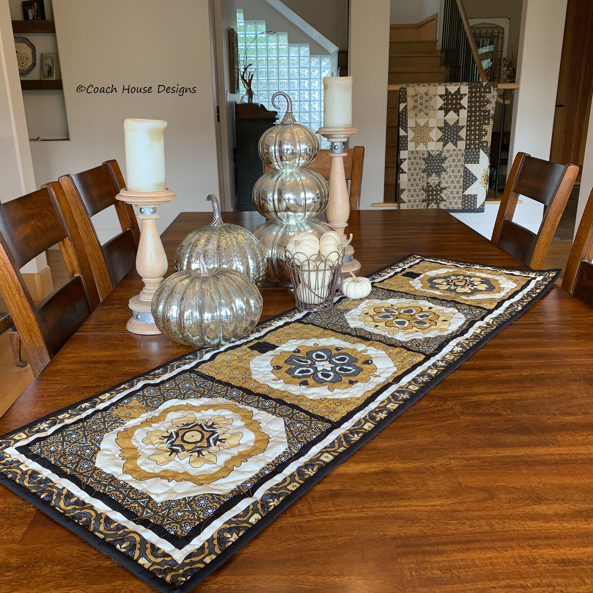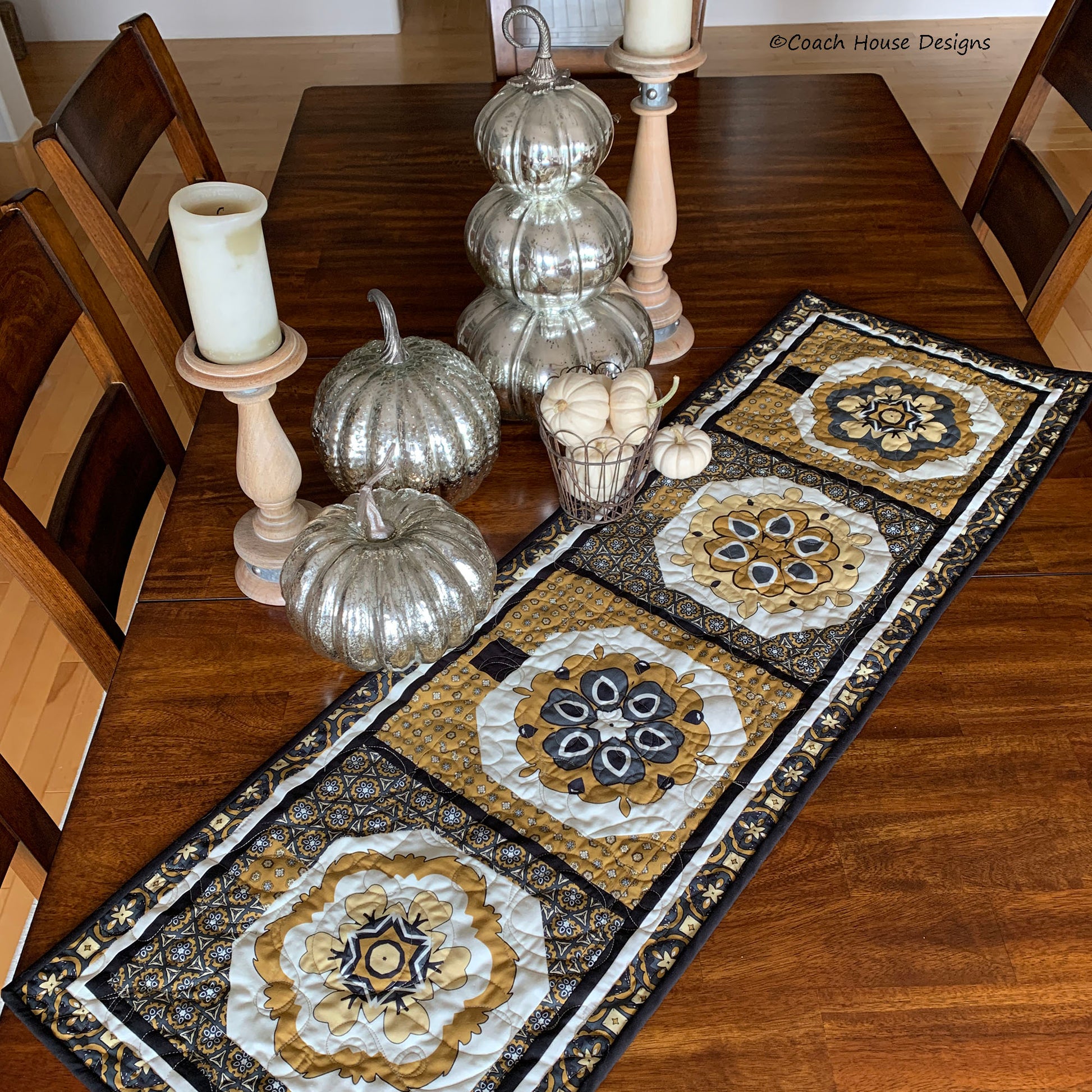 Celebrate the fall season with this quick 17" x 54" elegant table runner. The pumpkins are made with a panel from my Modern Farmhouse fabric line and the whole project can be completed in a day. Perfect addition to your fall decorations or as a gift for a friend.