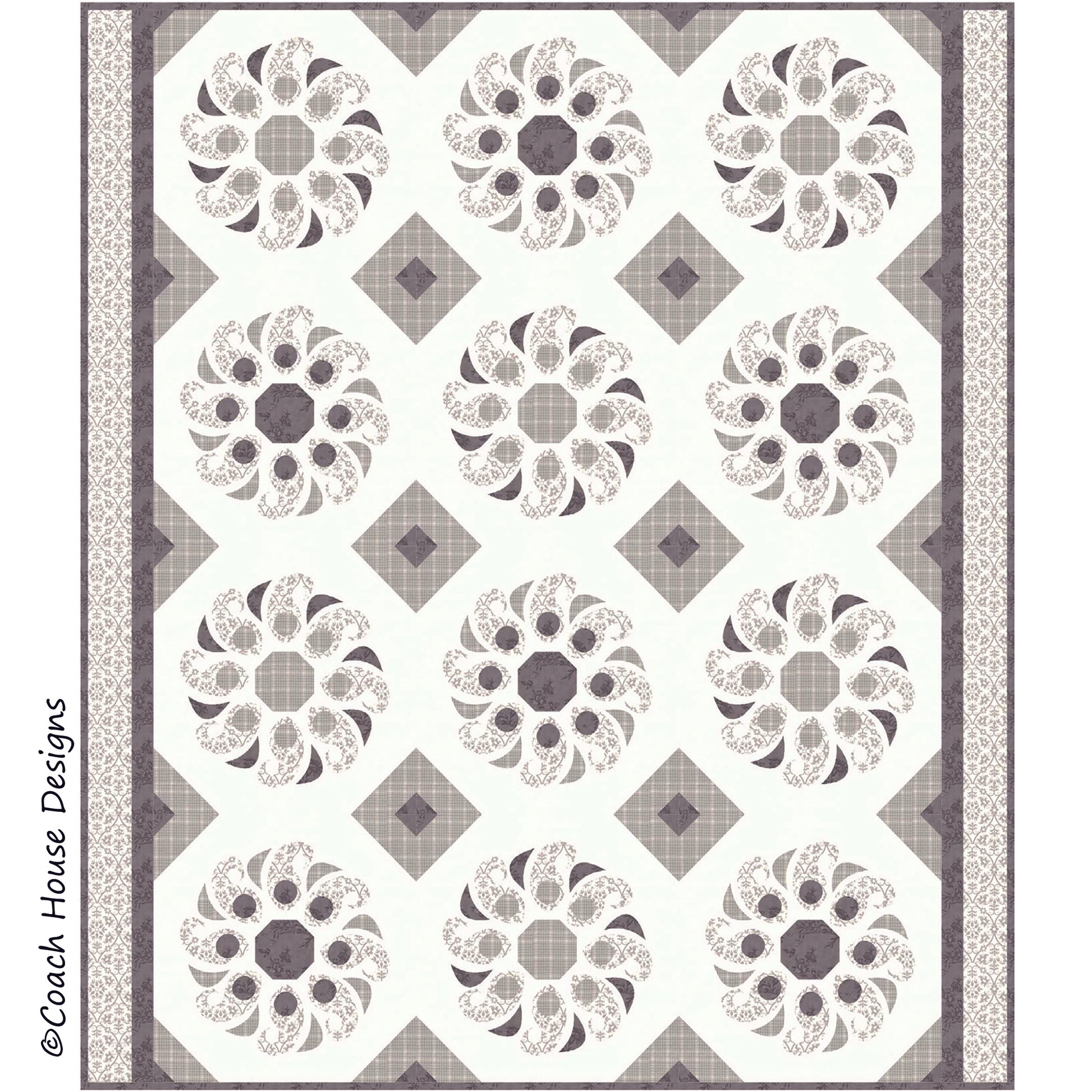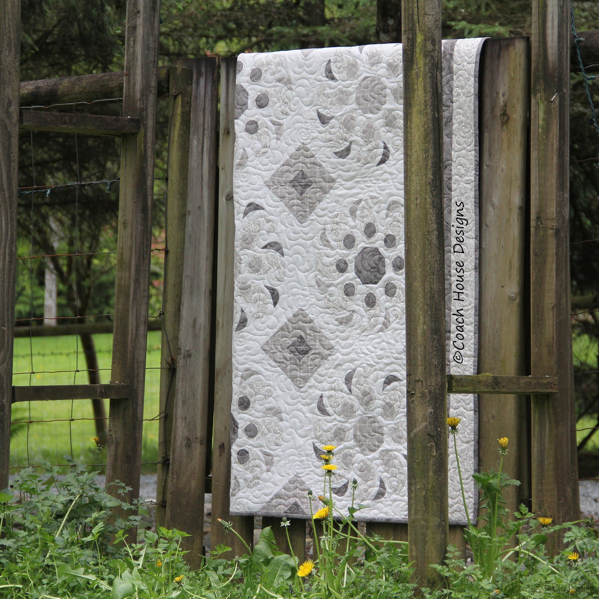 Elegant and sophisticated grey and white mandala lap quilt (63" x 72") with piecing and applique. The original sample features "Poetry" fabric line by 3 Sisters which was released in February 2017. Not to worry!
