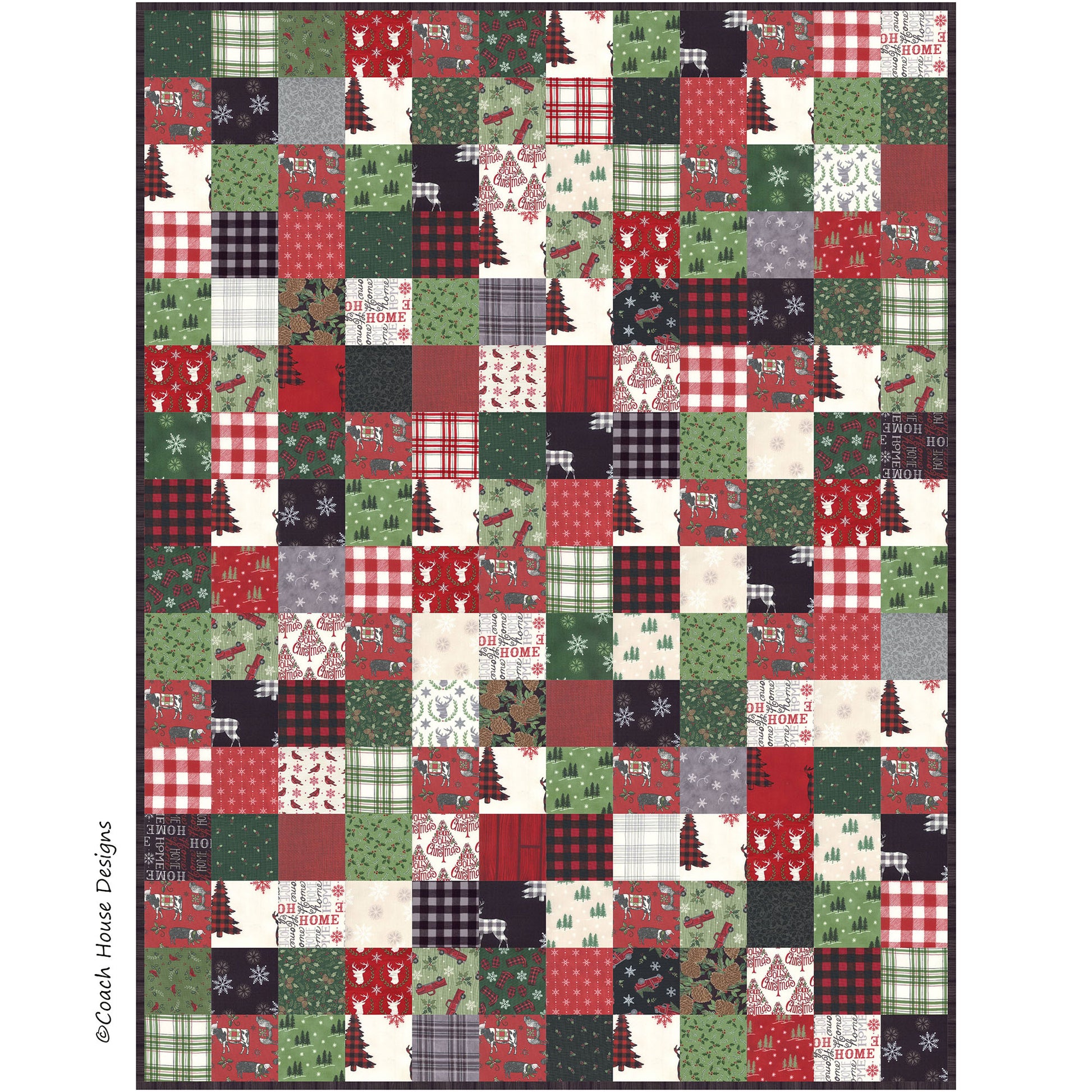 This scrappy Christmas quilt kit contains 192 pre-cut 4 1/2" squares curated from the last 5 years of Deb Strain's Christmas fabrics. The squares were cut with an Accuquilt and the kit makes a 48" x 64" lap quilt. This binding fabric for this kit is a black wood grain print. It's a simple project for your home or a Christmas gift for someone special.