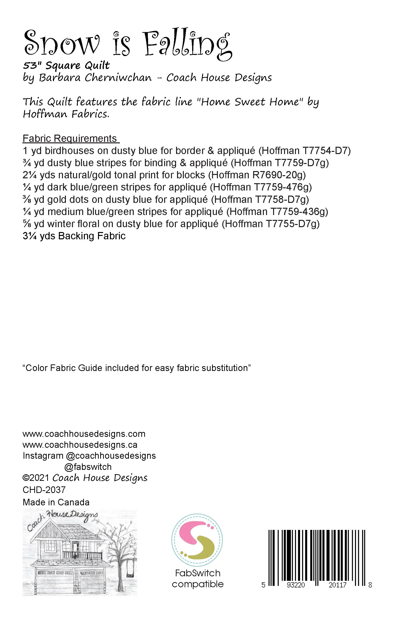 This pattern is FabSwitch compatible. FabSwitch is my free app which allows you to switch out the fabrics in the original design with current fabrics preloaded in the app or with fabrics that you load yourself. You can then print out a revised picture with an updated fabric requirements list. Check out my demo video on the home page. The app is found online at app.fabswitch. com.