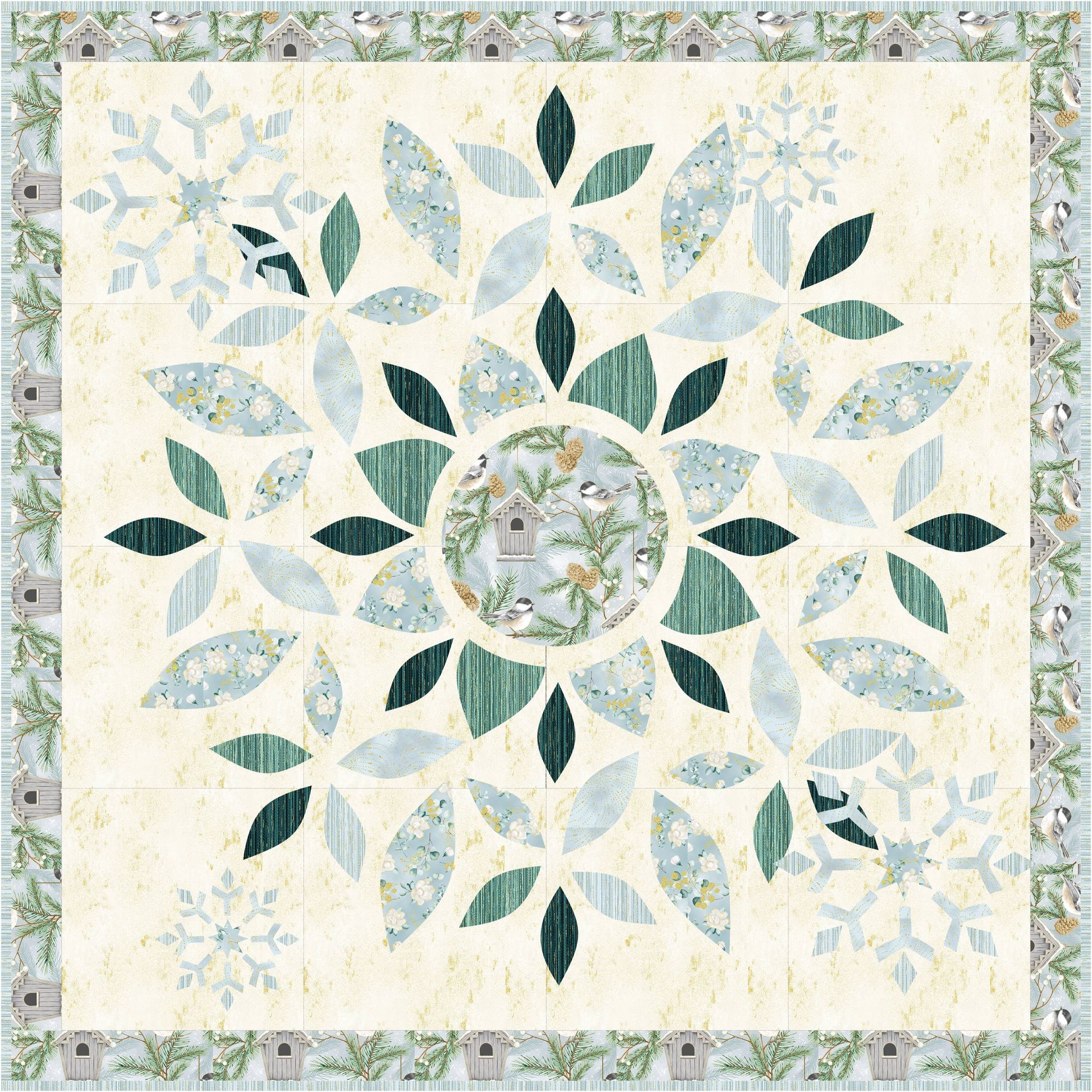 This 53” square wall quilt pattern features appliquéd snowflakes cascading down around a central appliquéd mandala. It looks very elegant in the blue, teal and gold Christmas fabric line “Home Sweet Home” by Hoffman Fabrics. The fabric will be in stores in May 2021.