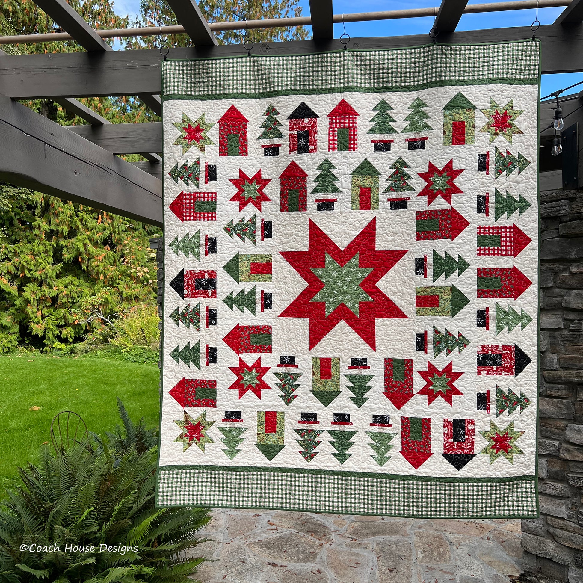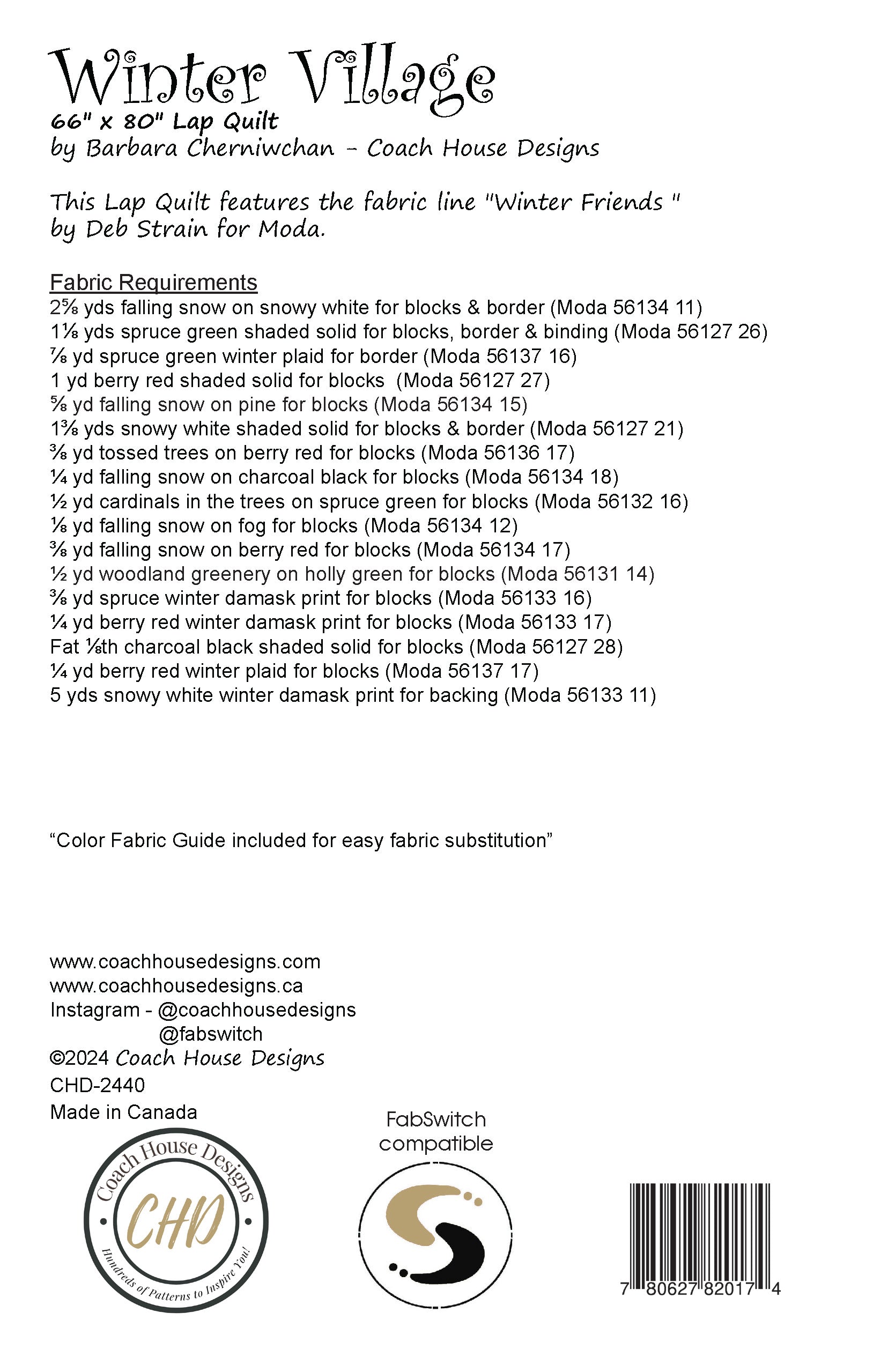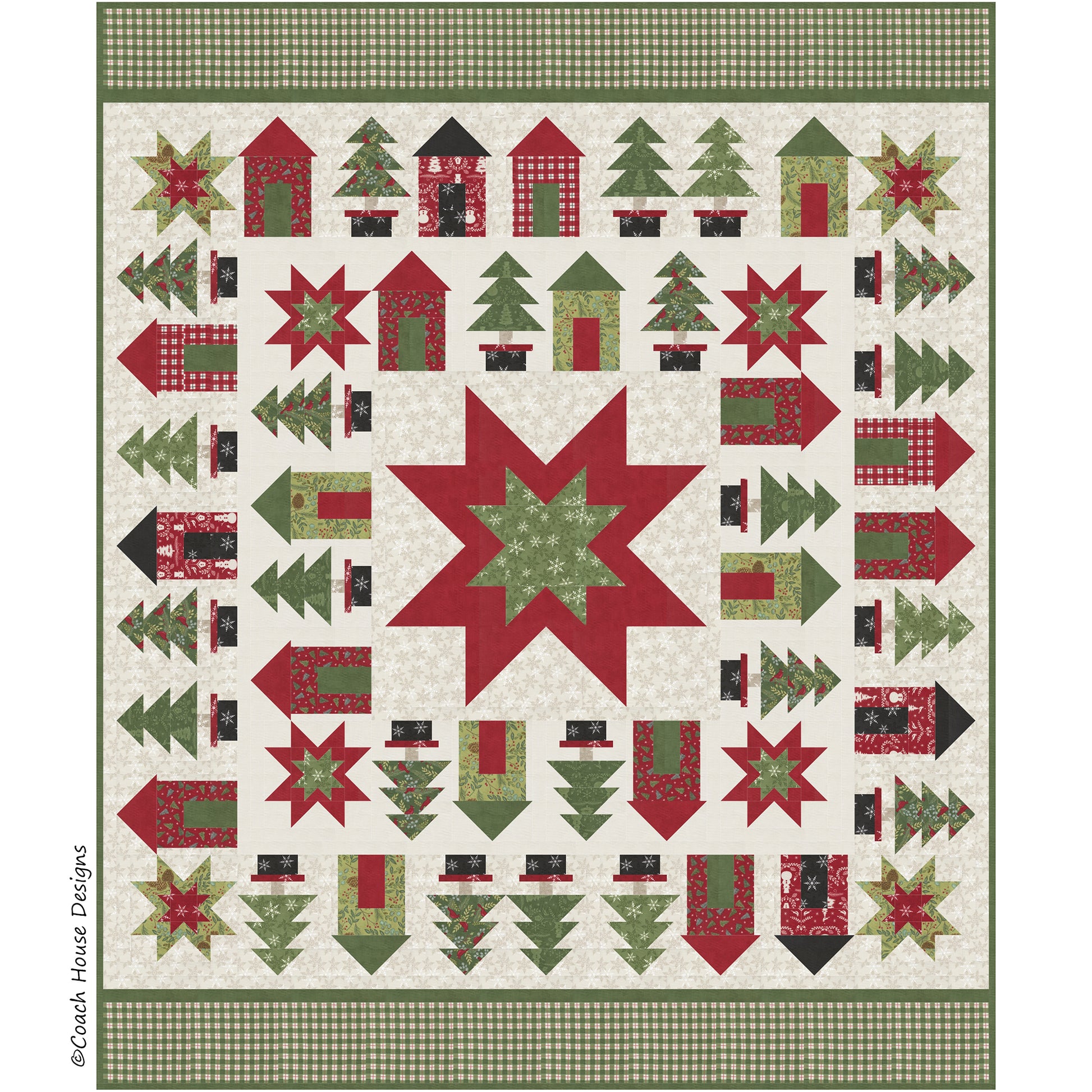66" x 80" holiday lap quilt featuring the fabric line "Winter Friends" by Deb Strain for Moda Fabrics. Round and round the village square, houses and trees are set facing the central star. This project is perfect for winter and Christmas..